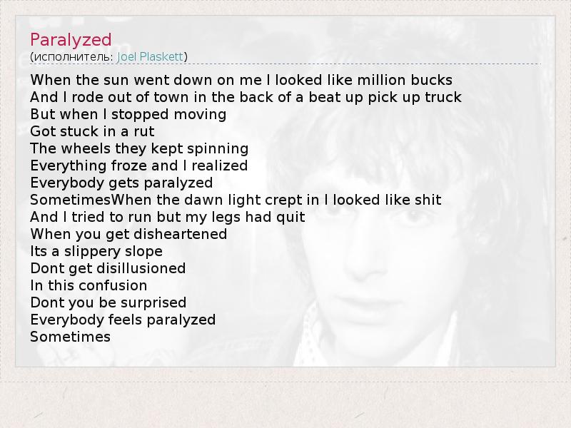 When the sun went down on me I looked like million bucks And I rode out of town in the back of a beat up pick up truck But when I stopped moving Got stuck in a rut The wheels they kept spinning Everything froze and I realized Everybody gets paralyzed SometimesWhen the dawn light crept in I looked like shit And I tried to run but my legs had quit When you get disheartened Its a slippery slope Dont get disillusioned In this confusion Dont you be surprised Everybody feels paralyzed Sometimes