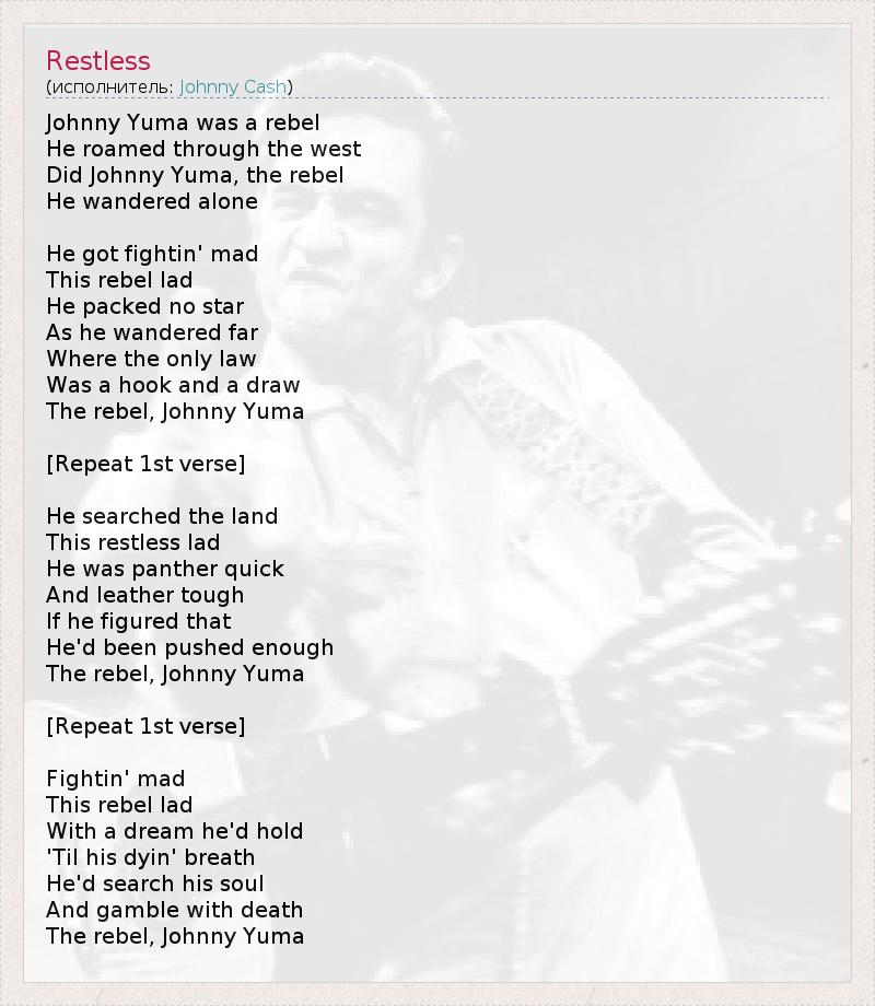 Это интересно:Джо́нни Кэш (англ. Johnny Cash; 26 февраля 1932, Кингсленд, Арканзас — 12 сентября 2003, Нашвилл, Теннесси) — американский певец и композитор-песенник, ключевая фигура в музыке кантри, считается одним из самых влиятельных музыкантов XX века. Несмотря на то, что в первую очередь его признали иконой кантри, исполнение песен в таких жанрах как госпел, рок-н-ролл и рокабилли — не редкость. Благодаря своей... продолжение