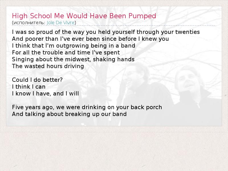 ГлавнаяИсполнителиJoie De VivreHigh School Me Would Have Been Pumped