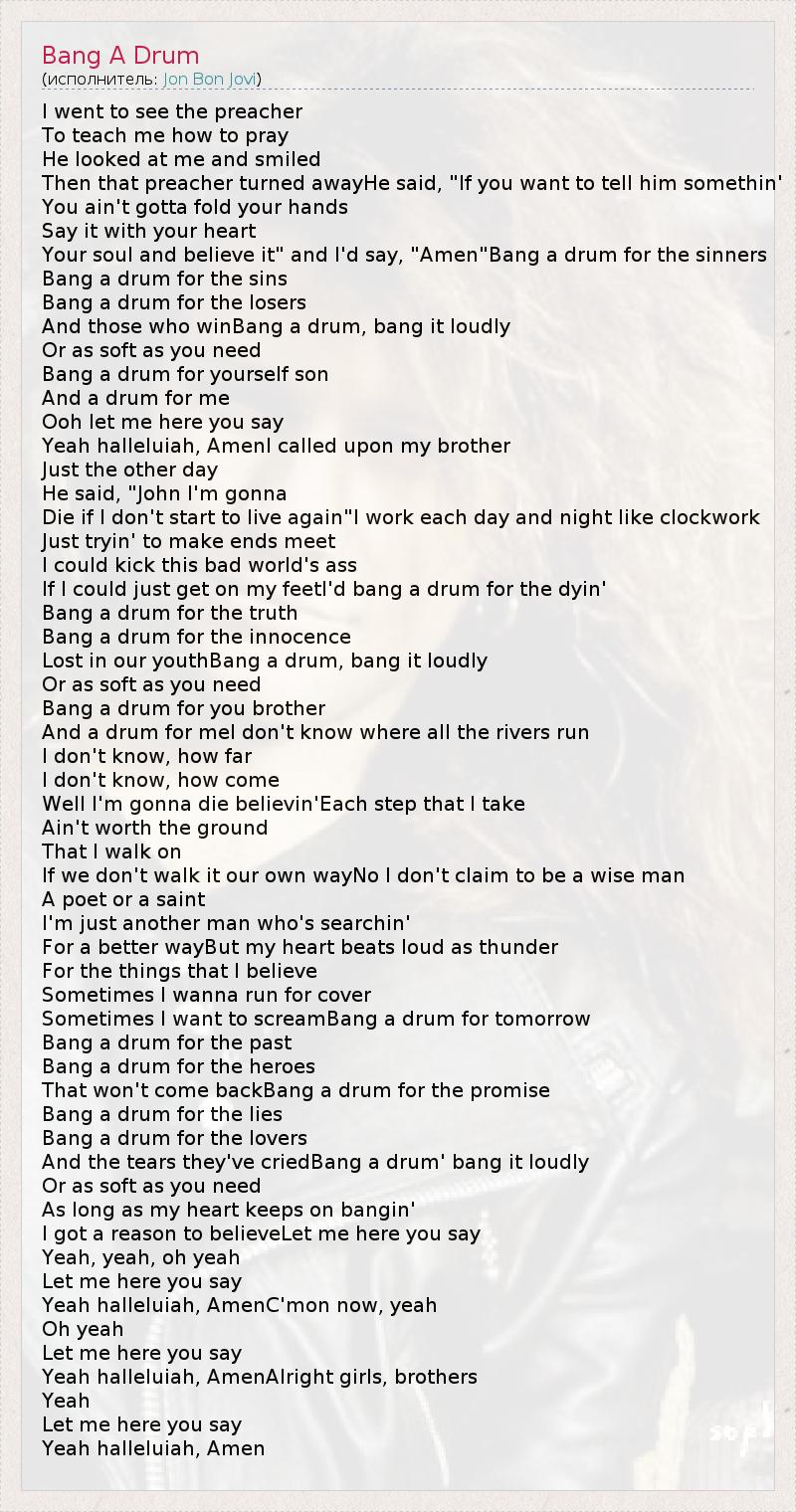 Your soul and believe it" and I'd say, "Amen"Bang a drum for the sinners