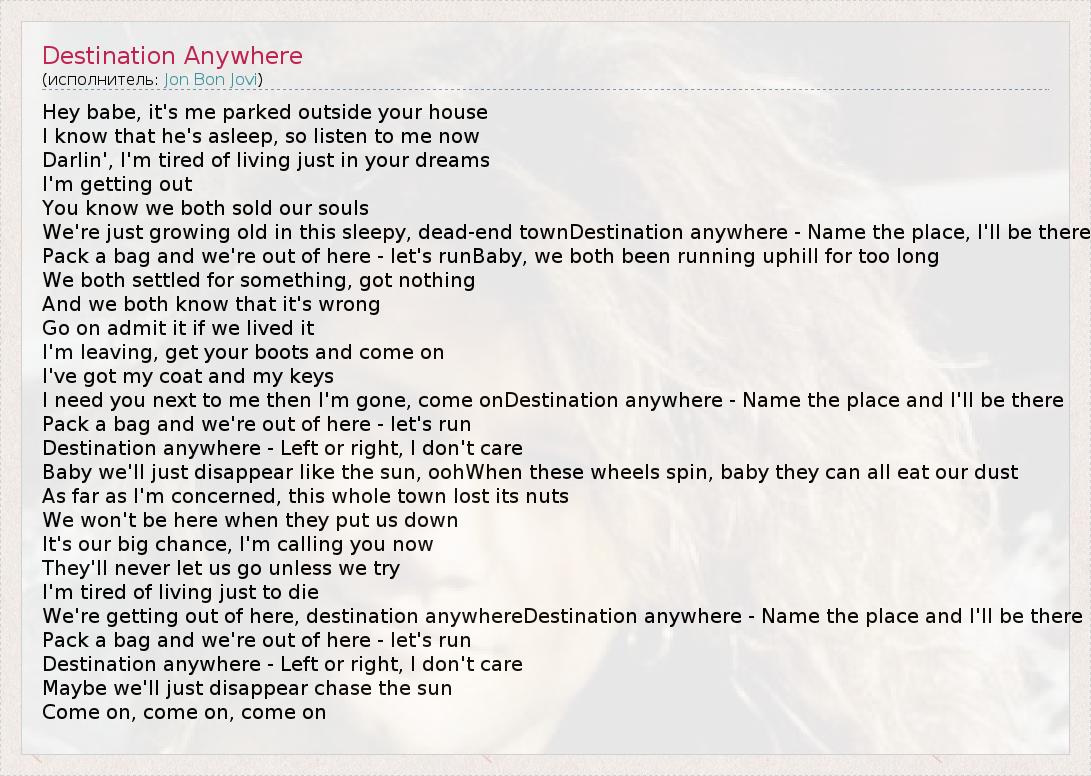 А как ты думаешь, о чем песня "Destination Anywhere" ?