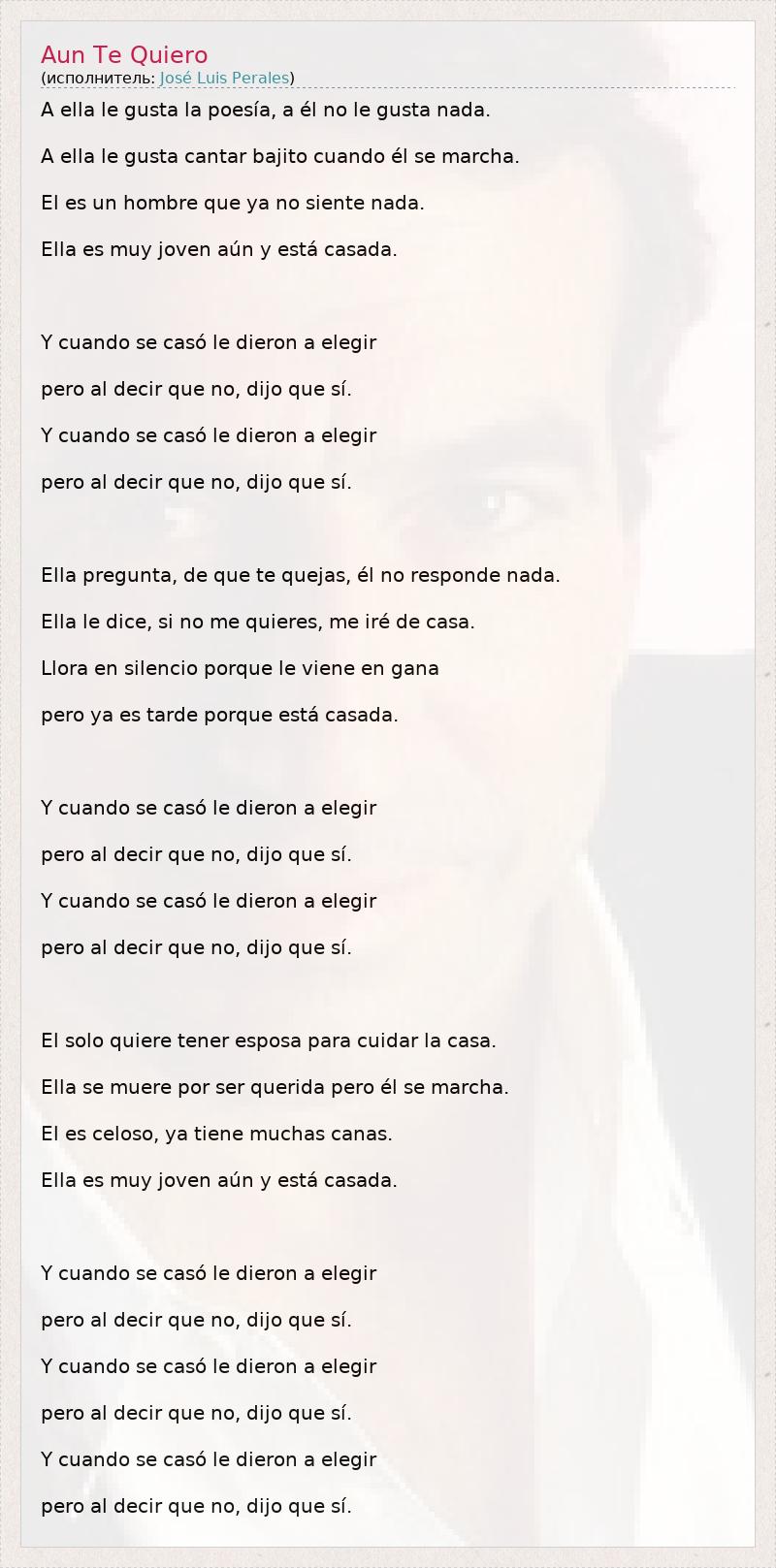 A ella le gusta la poesía, a él no le gusta nada. A ella le gusta cantar bajito cuando él se marcha. El es un hombre que ya no siente nada. Ella es muy joven aún y está casada. Y cuando se casó le dieron a elegir pero al decir que no, dijo que sí. Y cuando se casó le dieron a elegir pero al decir que no, dijo que sí. Ella pregunta, de que te quejas, él no responde nada. Ella le dice, si no me quieres, me iré de casa. Llora en silencio porque le viene en gana pero ya es tarde porque está casada. Y cuando se casó le dieron a elegir pero al decir que no, dijo que sí. Y cuando se casó le dieron a elegir pero al decir que no, dijo que sí. El solo quiere tener esposa para cuidar la casa. Ella se muere por ser querida pero él se marcha. El es celoso, ya tiene muchas canas. Ella es muy joven aún y está casada. Y cuando se casó le dieron a elegir pero al decir que no, dijo que sí. Y cuando se casó le dieron a elegir pero al decir que no, dijo que sí. Y cuando se casó le dieron a elegir pero al decir que no, dijo que sí.