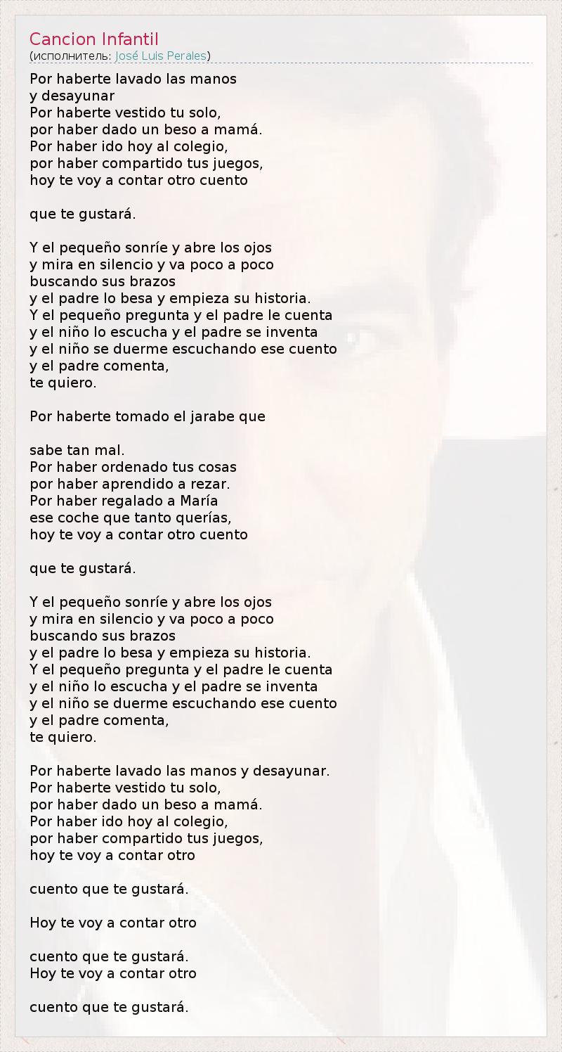 Por haberte lavado las manos y desayunar Por haberte vestido tu solo, por haber dado un beso a mamá. Por haber ido hoy al colegio, por haber compartido tus juegos, hoy te voy a contar otro cuento que te gustará. Y el pequeño sonríe y abre los ojos y mira en silencio y va poco a poco buscando sus brazos y el padre lo besa y empieza su historia. Y el pequeño pregunta y el padre le cuenta y el niño lo escucha y el padre se inventa y el niño se duerme escuchando ese cuento y el padre comenta, te quiero. Por haberte tomado el jarabe que sabe tan mal. Por haber ordenado tus cosas por haber aprendido a rezar. Por haber regalado a María ese coche que tanto querías, hoy te voy a contar otro cuento que te gustará. Y el pequeño sonríe y abre los ojos y mira en silencio y va poco a poco buscando sus brazos y el padre lo besa y empieza su historia. Y el pequeño pregunta y el padre le cuenta y el niño lo escucha y el padre se inventa y el niño se duerme escuchando ese cuento y el padre comenta, te quiero. Por haberte lavado las manos y desayunar. Por haberte vestido tu solo, por haber dado un beso a mamá. Por haber ido hoy al colegio, por haber compartido tus juegos, hoy te voy a contar otro cuento que te gustará. Hoy te voy a contar otro cuento que te gustará. Hoy te voy a contar otro cuento que te gustará.