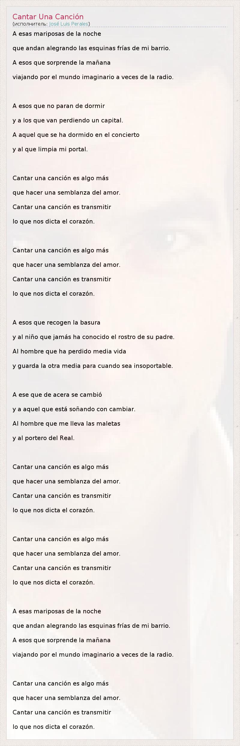 A esas mariposas de la noche que andan alegrando las esquinas frías de mi barrio. A esos que sorprende la mañana viajando por el mundo imaginario a veces de la radio. A esos que no paran de dormir y a los que van perdiendo un capital. A aquel que se ha dormido en el concierto y al que limpia mi portal. Cantar una canción es algo más que hacer una semblanza del amor. Cantar una canción es transmitir lo que nos dicta el corazón. Cantar una canción es algo más que hacer una semblanza del amor. Cantar una canción es transmitir lo que nos dicta el corazón. A esos que recogen la basura y al niño que jamás ha conocido el rostro de su padre. Al hombre que ha perdido media vida y guarda la otra media para cuando sea insoportable. A ese que de acera se cambió y a aquel que está soñando con cambiar. Al hombre que me lleva las maletas y al portero del Real. Cantar una canción es algo más que hacer una semblanza del amor. Cantar una canción es transmitir lo que nos dicta el corazón. Cantar una canción es algo más que hacer una semblanza del amor. Cantar una canción es transmitir lo que nos dicta el corazón. A esas mariposas de la noche que andan alegrando las esquinas frías de mi barrio. A esos que sorprende la mañana viajando por el mundo imaginario a veces de la radio. Cantar una canción es algo más que hacer una semblanza del amor. Cantar una canción es transmitir lo que nos dicta el corazón.