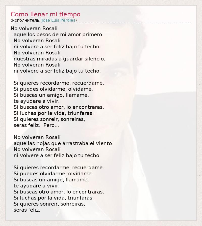 Это интересно:José Luis Perales José Luis Perales Birth name José Luis Perales Morillas Born 28 January 1945 (1945-01-28) (age 66)Castejón, Cuenca, Spain Genres BaladaRomantic music Occupations Musician, Songwriter Instruments Guitar, Vocals Years active 1972-present Labels Hispavox, Sony Music / BMG, Columbia Records Website http://www.joseluisperales.net/ (Spanish) José Luis Perales (born January 28, 1945 in Castejón, Cuenca Province) is a Spanish singer-songwriter and composer who is very popular in Spain and Latin America. He has performed some of his extensive work... продолжение