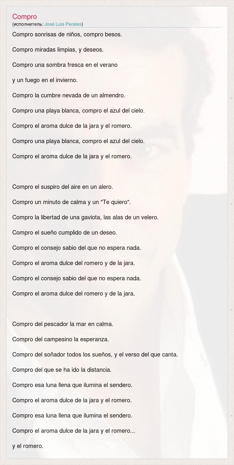 Compro sonrisas de niños, compro besos. Compro miradas limpias, y deseos. Compro una sombra fresca en el verano y un fuego en el invierno. Compro la cumbre nevada de un almendro. Compro una playa blanca, compro el azul del cielo. Compro el aroma dulce de la jara y el romero. Compro una playa blanca, compro el azul del cielo. Compro el aroma dulce de la jara y el romero. Compro el suspiro del aire en un alero. Compro un minuto de calma y un "Te quiero". Compro la libertad de una gaviota, las alas de un velero. Compro el sueño cumplido de un deseo. Compro el consejo sabio del que no espera nada. Compro el aroma dulce del romero y de la jara. Compro el consejo sabio del que no espera nada. Compro el aroma dulce del romero y de la jara. Compro del pescador la mar en calma. Compro del campesino la esperanza. Compro del soñador todos los sueños, y el verso del que canta. Compro del que se ha ido la distancia. Compro esa luna llena que ilumina el sendero. Compro el aroma dulce de la jara y el romero. Compro esa luna llena que ilumina el sendero. Compro el aroma dulce de la jara y el romero... y el romero.