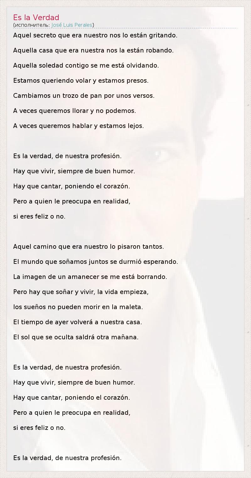 Это интересно:José Luis Perales José Luis Perales Birth name José Luis Perales Morillas Born 28 January 1945 (1945-01-28) (age 66)Castejón, Cuenca, Spain Genres BaladaRomantic music Occupations Musician, Songwriter Instruments Guitar, Vocals Years active 1972-present Labels Hispavox, Sony Music / BMG, Columbia Records Website http://www.joseluisperales.net/ (Spanish) José Luis Perales (born January 28, 1945 in Castejón, Cuenca Province) is a Spanish singer-songwriter and composer who is very popular in Spain and Latin America. He has performed some of his extensive work... продолжение