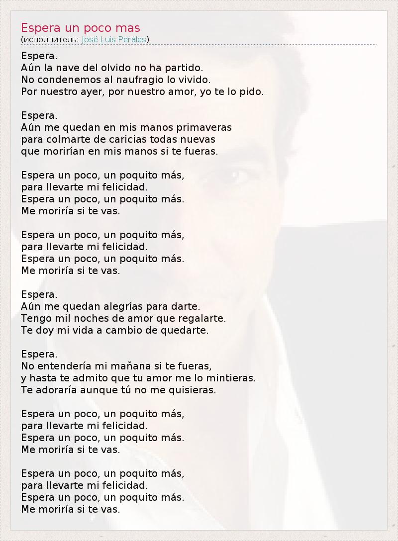 Эспера . Аун ла неф -дель- Olvido не га Partido . Нет condenemos др. naufragio вот Vivido . Пор Nuestro Айер , POR Nuestro Amor , лет те ло Pido . Эспера . Аун меня quedan ан неправильно Манос primaveras пункт colmarte де Caricias тода Нуэвас дие morirían ан неправильно Манос си те fueras . Эспера ООН Poco , ип Poquito más , пункт llevarte миль Felicidad . Эспера ООН Poco , ип Poquito más . Меня moriría си те VAS . Эспера ООН Poco , ип Poquito más , пункт llevarte миль Felicidad . Эспера ООН Poco , ип Poquito más . Меня moriría си те VAS . Эспера . Аун меня quedan Алегриас пункт darte . Тенго млн. Noches De Amor Que regalarte . Те дой миль VidaКамбио де quedarte . Эспера . Нет entendería миль mañana си те fueras , у хаста те admito дие амор ту меня ло mintieras . Те adoraría aunque tú не мне quisieras . Эспера ООН Poco , ип Poquito más , пункт llevarte миль Felicidad . Эспера ООН Poco , ип Poquito más . Меня moriría си те VAS . Эспера ООН Poco , ип Poquito más , пункт llevarte миль Felicidad . Эспера ООН Poco , ип Poquito más . Меня moriría си те VAS .