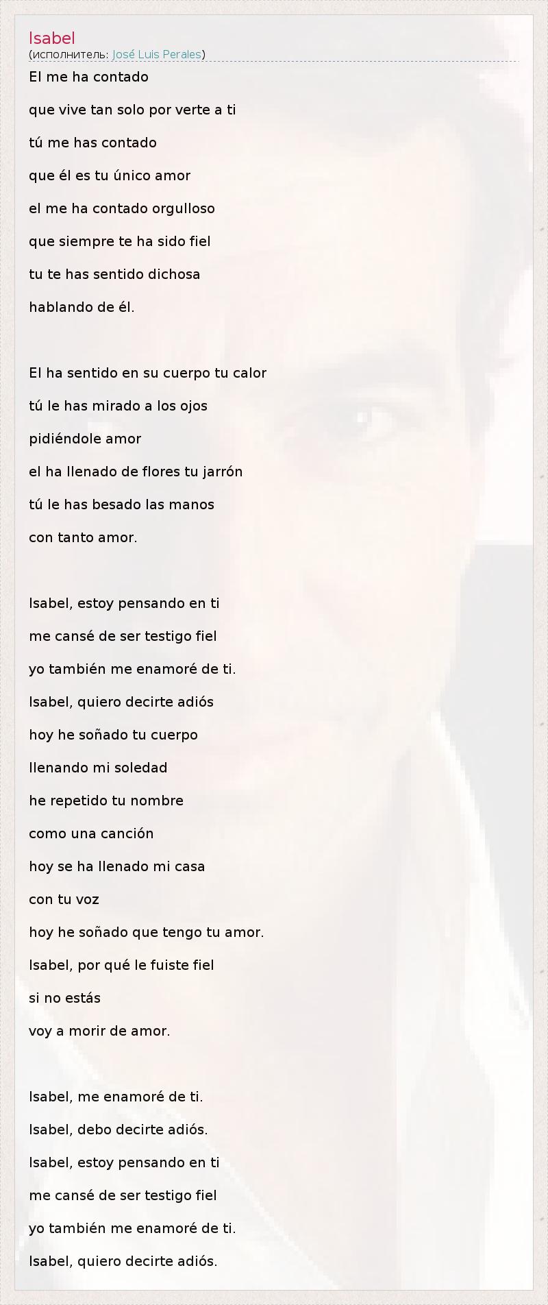 Это интересно:José Luis Perales José Luis Perales Birth name José Luis Perales Morillas Born 28 January 1945 (1945-01-28) (age 66)Castejón, Cuenca, Spain Genres BaladaRomantic music Occupations Musician, Songwriter Instruments Guitar, Vocals Years active 1972-present Labels Hispavox, Sony Music / BMG, Columbia Records Website http://www.joseluisperales.net/ (Spanish) José Luis Perales (born January 28, 1945 in Castejón, Cuenca Province) is a Spanish singer-songwriter and composer who is very popular in Spain and Latin America. He has performed some of his extensive work... продолжение