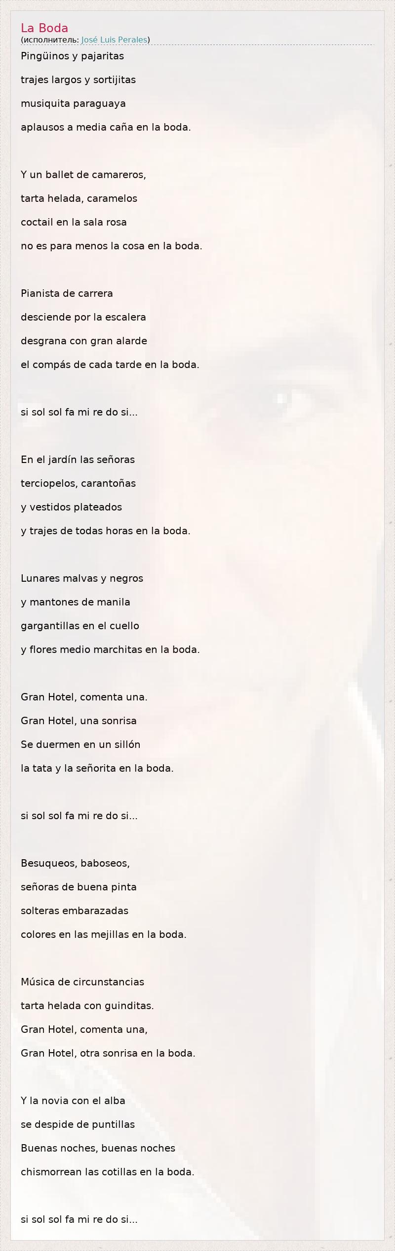 Это интересно:José Luis Perales José Luis Perales Birth name José Luis Perales Morillas Born 28 January 1945 (1945-01-28) (age 66)Castejón, Cuenca, Spain Genres BaladaRomantic music Occupations Musician, Songwriter Instruments Guitar, Vocals Years active 1972-present Labels Hispavox, Sony Music / BMG, Columbia Records Website http://www.joseluisperales.net/ (Spanish) José Luis Perales (born January 28, 1945 in Castejón, Cuenca Province) is a Spanish singer-songwriter and composer who is very popular in Spain and Latin America. He has performed some of his extensive work... продолжение