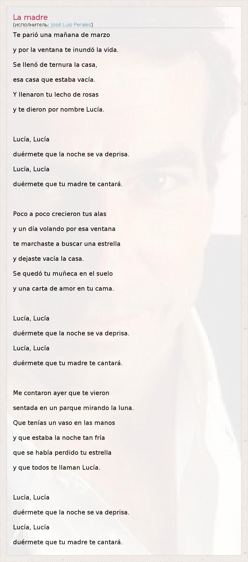 Te parió una mañana de marzo y por la ventana te inundó la vida. Se llenó de ternura la casa, esa casa que estaba vacía. Y llenaron tu lecho de rosas y te dieron por nombre Lucía. Lucía, Lucía duérmete que la noche se va deprisa. Lucía, Lucía duérmete que tu madre te cantará. Poco a poco crecieron tus alas y un día volando por esa ventana te marchaste a buscar una estrella y dejaste vacía la casa. Se quedó tu muñeca en el suelo y una carta de amor en tu cama. Lucía, Lucía duérmete que la noche se va deprisa. Lucía, Lucía duérmete que tu madre te cantará. Me contaron ayer que te vieron sentada en un parque mirando la luna. Que tenías un vaso en las manos y que estaba la noche tan fría que se había perdido tu estrella y que todos te llaman Lucía. Lucía, Lucía duérmete que la noche se va deprisa. Lucía, Lucía duérmete que tu madre te cantará.