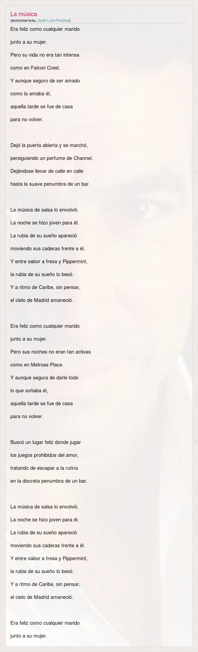 Это интересно:José Luis Perales José Luis Perales Birth name José Luis Perales Morillas Born 28 January 1945 (1945-01-28) (age 66)Castejón, Cuenca, Spain Genres BaladaRomantic music Occupations Musician, Songwriter Instruments Guitar, Vocals Years active 1972-present Labels Hispavox, Sony Music / BMG, Columbia Records Website http://www.joseluisperales.net/ (Spanish) José Luis Perales (born January 28, 1945 in Castejón, Cuenca Province) is a Spanish singer-songwriter and composer who is very popular in Spain and Latin America. He has performed some of his extensive work... продолжение