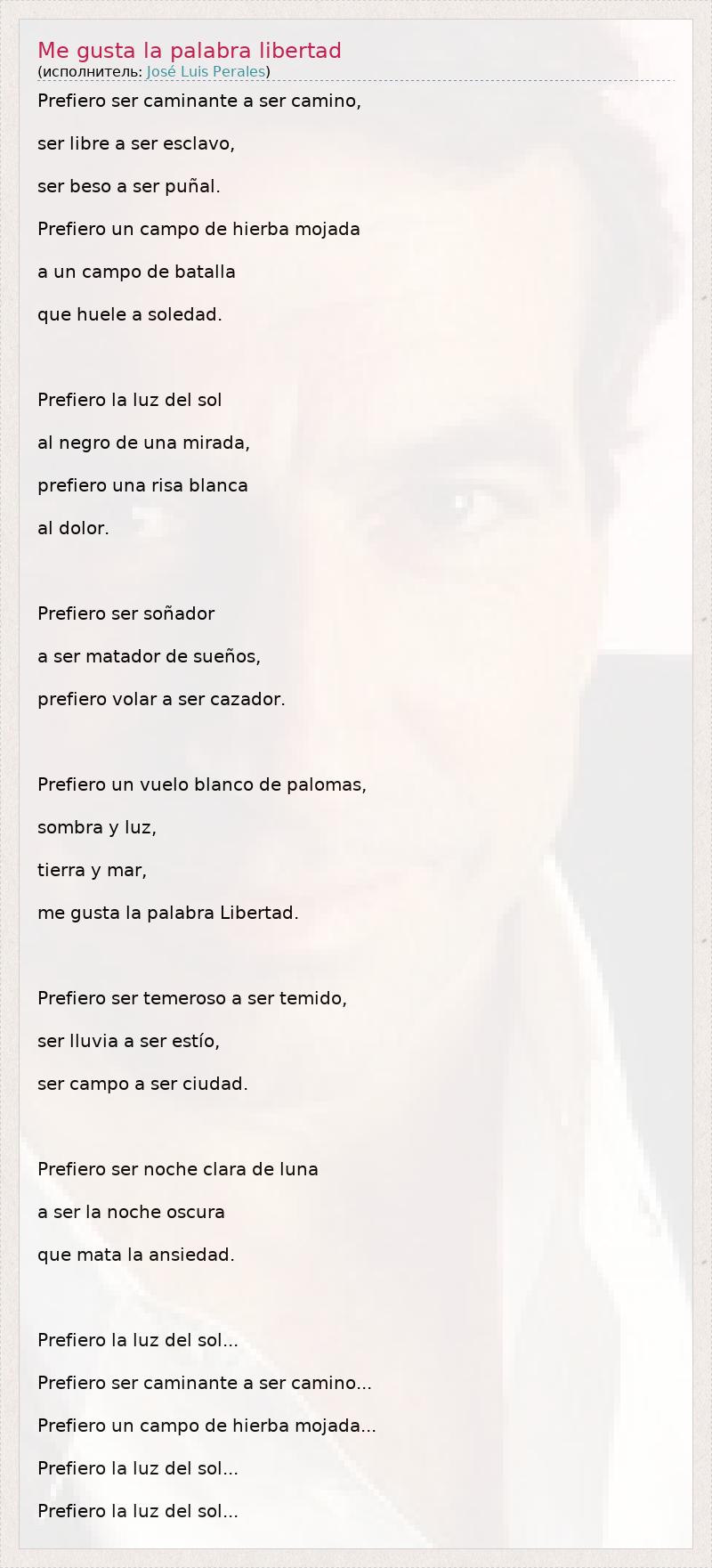 Prefiero ser caminante a ser camino, ser libre a ser esclavo, ser beso a ser puñal. Prefiero un campo de hierba mojada a un campo de batalla que huele a soledad. Prefiero la luz del sol al negro de una mirada, prefiero una risa blanca al dolor. Prefiero ser soñador a ser matador de sueños, prefiero volar a ser cazador. Prefiero un vuelo blanco de palomas, sombra y luz, tierra y mar, me gusta la palabra Libertad. Prefiero ser temeroso a ser temido, ser lluvia a ser estío, ser campo a ser ciudad. Prefiero ser noche clara de luna a ser la noche oscura que mata la ansiedad. Prefiero la luz del sol... Prefiero ser caminante a ser camino... Prefiero un campo de hierba mojada... Prefiero la luz del sol... Prefiero la luz del sol...