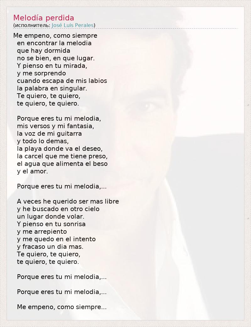 Me empeno, como siempre en encontrar la melodia que hay dormida no se bien, en que lugar. Y pienso en tu mirada, y me sorprendo cuando escapa de mis labios la palabra en singular. Te quiero, te quiero, te quiero, te quiero. Porque eres tu mi melodia, mis versos y mi fantasia, la voz de mi guitarra y todo lo demas, la playa donde va el deseo, la carcel que me tiene preso, el agua que alimenta el beso y el amor. Porque eres tu mi melodia,... A veces he querido ser mas libre y he buscado en otro cielo un lugar donde volar. Y pienso en tu sonrisa y me arrepiento y me quedo en el intento y fracaso un dia mas. Te quiero, te quiero, te quiero, te quiero. Porque eres tu mi melodia,... Porque eres tu mi melodia,... Me empeno, como siempre...