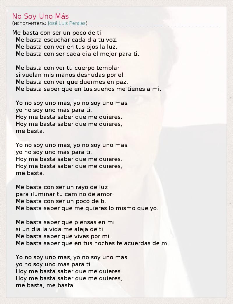 Me basta con ser un poco de ti. Me basta escuchar cada dia tu voz. Me basta con ver en tus ojos la luz. Me basta con ser cada dia el mejor para ti. Me basta con ver tu cuerpo temblar si vuelan mis manos desnudas por el. Me basta con ver que duermes en paz. Me basta saber que en tus suenos me tienes a mi. Yo no soy uno mas, yo no soy uno mas yo no soy uno mas para ti. Hoy me basta saber que me quieres. Hoy me basta saber que me quieres, me basta. Yo no soy uno mas, yo no soy uno mas yo no soy uno mas para ti. Hoy me basta saber que me quieres. Hoy me basta saber que me quieres, me basta. Me basta con ser un rayo de luz para iluminar tu camino de amor. Me basta con ser un poco de ti. Me basta saber que me quieres lo mismo que yo. Me basta saber que piensas en mi si un dia la vida me aleja de ti. Me basta saber que vives por mi. Me basta saber que en tus noches te acuerdas de mi. Yo no soy uno mas, yo no soy uno mas yo no soy uno mas para ti. Hoy me basta saber que me quieres. Hoy me basta saber que me quieres, me basta, me basta.