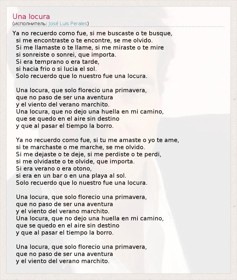 Ya no recuerdo como fue, si me buscaste o te busque, si me encontraste o te encontre, se me olvido. Si me llamaste o te llame, si me miraste o te mire si sonreiste o sonrei, que importa. Si era temprano o era tarde, si hacia frio o si lucia el sol. Solo recuerdo que lo nuestro fue una locura. Una locura, que solo florecio una primavera, que no paso de ser una aventura y el viento del verano marchito. Una locura, que no dejo una huella en mi camino, que se quedo en el aire sin destino y que al pasar el tiempo la borro. Ya no recuerdo como fue, si tu me amaste o yo te ame, si te marchaste o me marche, se me olvido. Si me dejaste o te deje, si me perdiste o te perdi, si me olvidaste o te olvide, que importa. Si era verano o era otono, si era en un bar o en una playa al sol. Solo recuerdo que lo nuestro fue una locura. Una locura, que solo florecio una primavera, que no paso de ser una aventura y el viento del verano marchito. Una locura, que no dejo una huella en mi camino, que se quedo en el aire sin destino y que al pasar el tiempo la borro. Una locura, que solo florecio una primavera, que no paso de ser una aventura y el viento del verano marchito.