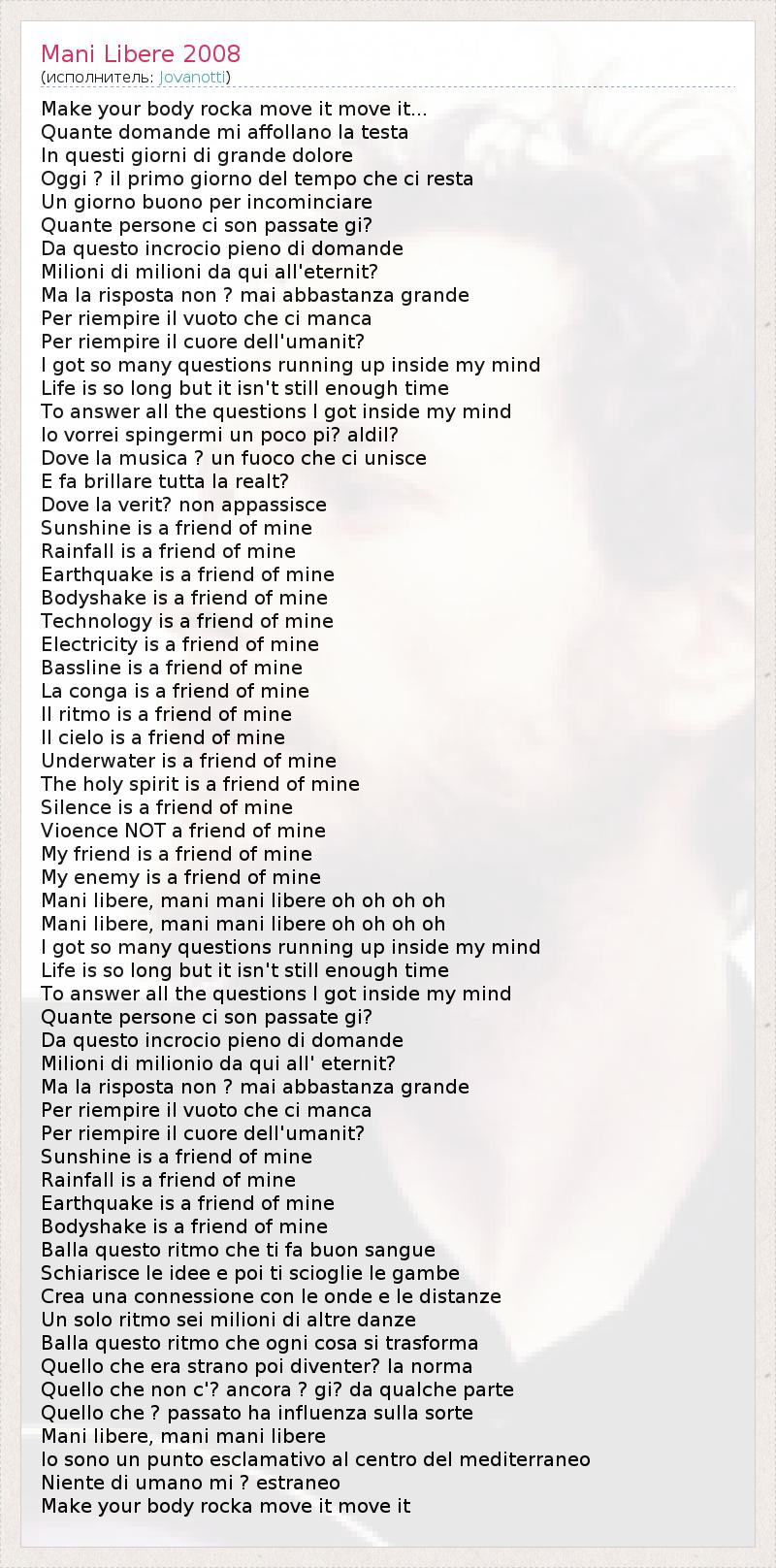 Make your body rocka move it move it... Quante domande mi affollano la testa In questi giorni di grande dolore Oggi ? il primo giorno del tempo che ci resta Un giorno buono per incominciare Quante persone ci son passate gi? Da questo incrocio pieno di domande Milioni di milioni da qui all'eternit? Ma la risposta non ? mai abbastanza grande Per riempire il vuoto che ci manca Per riempire il cuore dell'umanit? I got so many questions running up inside my mind Life is so long but it isn't still enough time To answer all the questions I got inside my mind Io vorrei spingermi un poco pi? aldil? Dove la musica ? un fuoco che ci unisce E fa brillare tutta la realt? Dove la verit? non appassisce Sunshine is a friend of mine Rainfall is a friend of mine Earthquake is a friend of mine Bodyshake is a friend of mine Technology is a friend of mine Electricity is a friend of mine Bassline is a friend of mine La conga is a friend of mine Il ritmo is a friend of mine Il cielo is a friend of mine Underwater is a friend of mine The holy spirit is a friend of mine Silence is a friend of mine Vioence NOT a friend of mine My friend is a friend of mine My enemy is a friend of mine Mani libere, mani mani libere oh oh oh oh Mani libere, mani mani libere oh oh oh oh I got so many questions running up inside my mind Life is so long but it isn't still enough time To answer all the questions I got inside my mind Quante persone ci son passate gi? Da questo incrocio pieno di domande Milioni di milionio da qui all' eternit? Ma la risposta non ? mai abbastanza grande Per riempire il vuoto che ci manca Per riempire il cuore dell'umanit? Sunshine is a friend of mine Rainfall is a friend of mine Earthquake is a friend of mine Bodyshake is a friend of mine Balla questo ritmo che ti fa buon sangue Schiarisce le idee e poi ti scioglie le gambe Crea una connessione con le onde e le distanze Un solo ritmo sei milioni di altre danze Balla questo ritmo che ogni cosa si trasforma Quello che era strano poi diventer? la norma Quello che non c'? ancora ? gi? da qualche parte Quello che ? passato ha influenza sulla sorte Mani libere, mani mani libere Io sono un punto esclamativo al centro del mediterraneo Niente di umano mi ? estraneo Make your body rocka move it move it