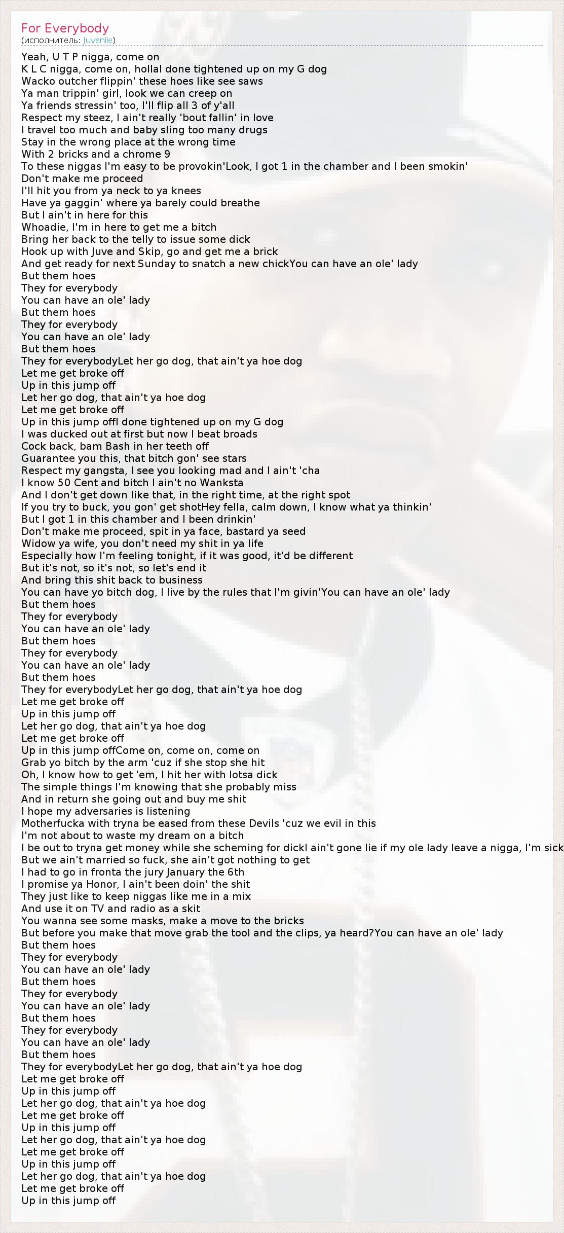 Yeah, U T P nigga, come on K L C nigga, come on, hollaI done tightened up on my G dog Wacko outcher flippin' these hoes like see saws Ya man trippin' girl, look we can creep on Ya friends stressin' too, I'll flip all 3 of y'all Respect my steez, I ain't really 'bout fallin' in love I travel too much and baby sling too many drugs Stay in the wrong place at the wrong time With 2 bricks and a chrome 9 To these niggas I'm easy to be provokin'Look, I got 1 in the chamber and I been smokin' Don't make me proceed I'll hit you from ya neck to ya knees Have ya gaggin' where ya barely could breathe But I ain't in here for this Whoadie, I'm in here to get me a bitch Bring her back to the telly to issue some dick Hook up with Juve and Skip, go and get me a brick And get ready for next Sunday to snatch a new chickYou can have an ole' lady But them hoes They for everybody You can have an ole' lady But them hoes They for everybody You can have an ole' lady But them hoes They for everybodyLet her go dog, that ain't ya hoe dog Let me get broke off Up in this jump off Let her go dog, that ain't ya hoe dog Let me get broke off Up in this jump offI done tightened up on my G dog I was ducked out at first but now I beat broads Cock back, bam Bash in her teeth off Guarantee you this, that bitch gon' see stars Respect my gangsta, I see you looking mad and I ain't 'cha I know 50 Cent and bitch I ain't no Wanksta And I don't get down like that, in the right time, at the right spot If you try to buck, you gon' get shotHey fella, calm down, I know what ya thinkin' But I got 1 in this chamber and I been drinkin' Don't make me proceed, spit in ya face, bastard ya seed Widow ya wife, you don't need my shit in ya life Especially how I'm feeling tonight, if it was good, it'd be different But it's not, so it's not, so let's end it And bring this shit back to business You can have yo bitch dog, I live by the rules that I'm givin'You can have an ole' lady But them hoes They for everybody You can have an ole' lady But them hoes They for everybody You can have an ole' lady But them hoes They for everybodyLet her go dog, that ain't ya hoe dog Let me get broke off Up in this jump off Let her go dog, that ain't ya hoe dog Let me get broke off Up in this jump offCome on, come on, come on Grab yo bitch by the arm 'cuz if she stop she hit Oh, I know how to get 'em, I hit her with lotsa dick The simple things I'm knowing that she probably miss And in return she going out and buy me shit I hope my adversaries is listening Motherfucka with tryna be eased from these Devils 'cuz we evil in this I'm not about to waste my dream on a bitch I be out to tryna get money while she scheming for dickI ain't gone lie if my ole lady leave a nigga, I'm sick But we ain't married so fuck, she ain't got nothing to get I had to go in fronta the jury January the 6th I promise ya Honor, I ain't been doin' the shit They just like to keep niggas like me in a mix And use it on TV and radio as a skit You wanna see some masks, make a move to the bricks But before you make that move grab the tool and the clips, ya heard?You can have an ole' lady But them hoes They for everybody You can have an ole' lady But them hoes They for everybody You can have an ole' lady But them hoes They for everybody You can have an ole' lady But them hoes They for everybodyLet her go dog, that ain't ya hoe dog Let me get broke off Up in this jump off Let her go dog, that ain't ya hoe dog Let me get broke off Up in this jump off Let her go dog, that ain't ya hoe dog Let me get broke off Up in this jump off Let her go dog, that ain't ya hoe dog Let me get broke off Up in this jump off