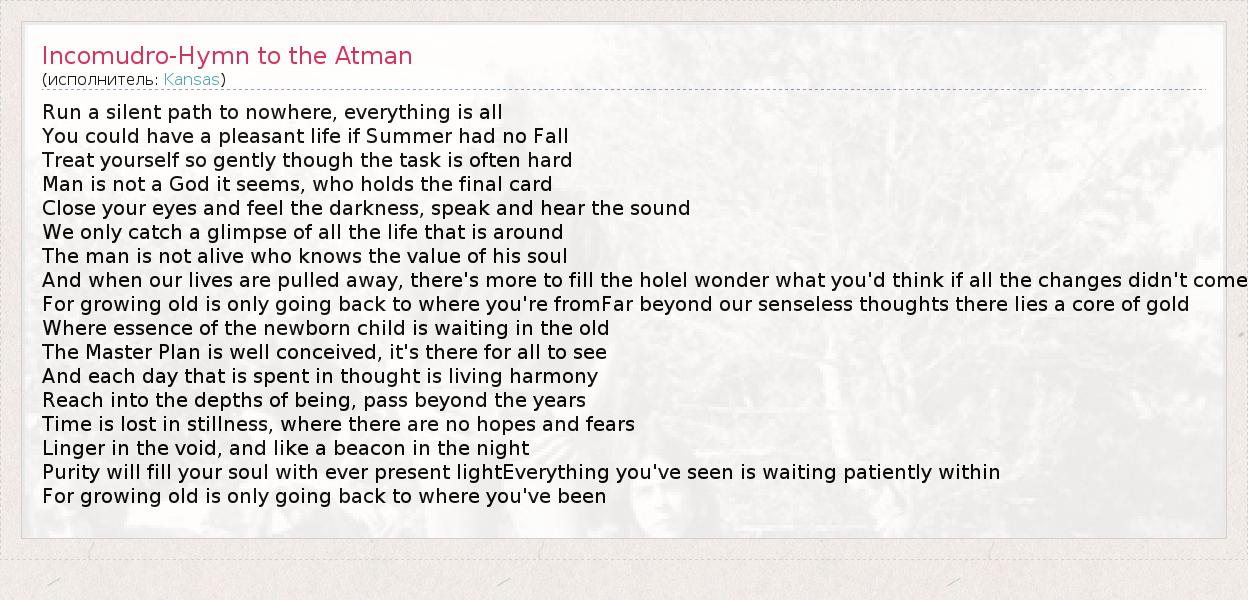 А как ты думаешь, о чем песня "Incomudro-Hymn to the Atman" ?