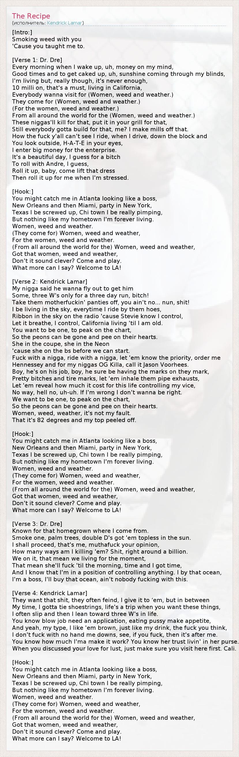 Это интересно:Кендрик Ламар (род. 17 июня 1987) — американский рэпер из г.Комптона, Калифорния, член группы Black Hippy, в чей состав также входят Jay Rock, Ab-Soul и ScHoolBoy Q. В 95-ом, его отец отвез юного Кендрика на съемки клипа «California Love» 2Pac’a и Dr. Dre, что предопределило его дальнейшую жизнь. Очень часто Кендрик... продолжение