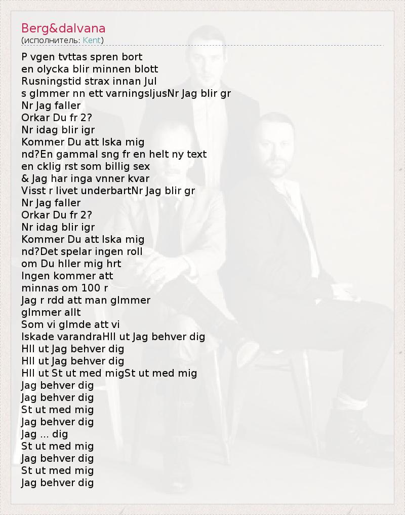 Это интересно:Есть два исполнителя с таким названием: 1) рок-группа из Швеции и 2) французский певец.1) Kent - Самая популярная рок-группа в Швеции, которая несколько раз подряд выигрывала местный приз "Grammy". Два последних альбома Kent стабильно становились первыми в национальных чартах. Европейское MTV невероятно долго показывало в эфире сингл Saker Man Ser (на шведском языке), и песню - 747.История на... продолжение