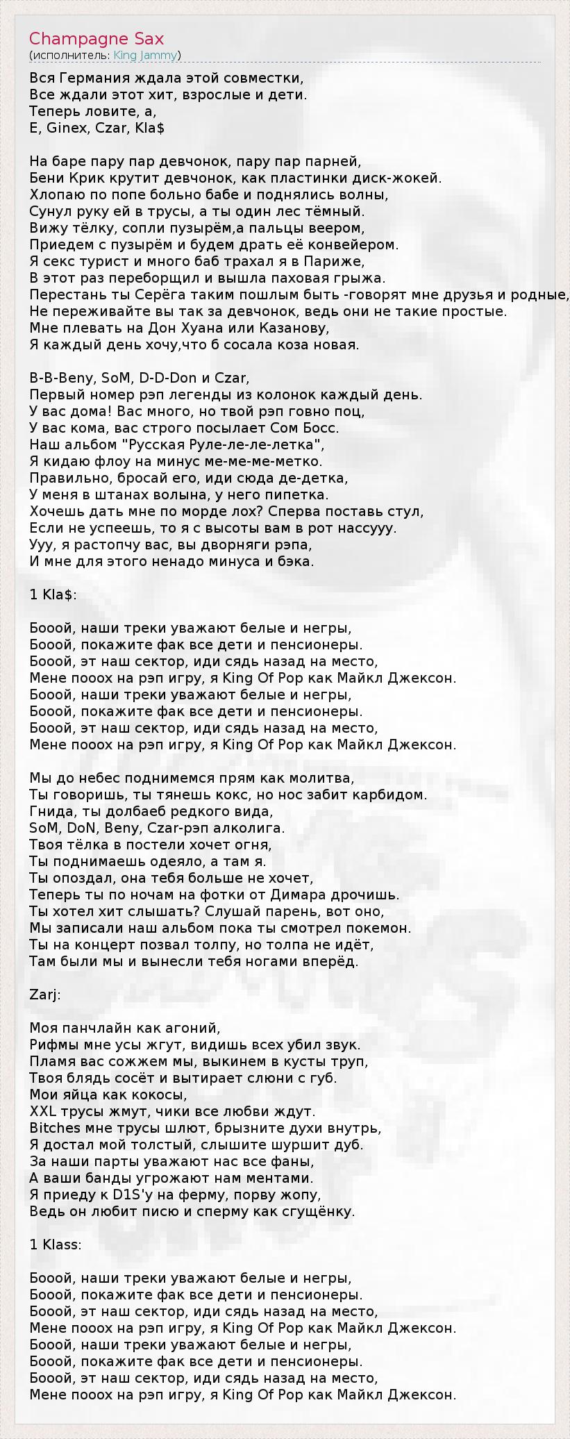 Вся Германия ждала этой совместки, Все ждали этот хит, взрослые и дети. Теперь ловите, а, Е, Ginex, Czar, Kla$ На баре пару пар девчонок, пару пар парней, Бени Крик крутит девчонок, как пластинки диск-жокей. Хлопаю по попе больно бабе и поднялись волны, Сунул руку ей в трусы, а ты один лес тёмный. Вижу тёлку, сопли пузырём,а пальцы веером, Приедем с пузырём и будем драть её конвейером. Я секс турист и много баб трахал я в Париже, В этот раз переборщил и вышла паховая грыжа. Перестань ты Серёга таким пошлым быть -говорят мне друзья и родные, Не переживайте вы так за девчонок, ведь они не такие простые. Мне плевать на Дон Хуана или Казанову, Я каждый день хочу,что б сосала коза новая. B-B-Beny, SoM, D-D-Don и Czar, Первый номер рэп легенды из колонок каждый день. У вас дома! Вас много, но твой рэп говно поц, У вас кома, вас строго посылает Сом Босс. Наш альбом "Русская Руле-ле-ле-летка", Я кидаю флоу на минус ме-ме-ме-метко. Правильно, бросай его, иди сюда де-детка, У меня в штанах волына, у него пипетка. Хочешь дать мне по морде лох? Сперва поставь стул, Если не успеешь, то я с высоты вам в рот нассууу. Ууу, я растопчу вас, вы дворняги рэпа, И мне для этого ненадо минуса и бэка. 1 Kla$: Бооой, наши треки уважают белые и негры, Бооой, покажите фак все дети и пенсионеры. Бооой, эт наш сектор, иди сядь назад на место, Мене пооох на рэп игру, я King Of Pop как Майкл Джексон. Бооой, наши треки уважают белые и негры, Бооой, покажите фак все дети и пенсионеры. Бооой, эт наш сектор, иди сядь назад на место, Мене пооох на рэп игру, я King Of Pop как Майкл Джексон. Мы до небес поднимемся прям как молитва, Ты говоришь, ты тянешь кокс, но нос забит карбидом. Гнида, ты долбаеб редкого вида, SoM, DoN, Beny, Czar-рэп алколига. Твоя тёлка в постели хочет огня, Ты поднимаешь одеяло, а там я. Ты опоздал, она тебя больше не хочет, Теперь ты по ночам на фотки от Димара дрочишь. Ты хотел хит слышать? Слушай парень, вот оно, Мы записали наш альбом пока ты смотрел покемон. Ты на концерт позвал толпу, но толпа не идёт, Там были мы и вынесли тебя ногами вперёд. Zarj: Моя панчлайн как агоний, Рифмы мне усы жгут, видишь всех убил звук. Пламя вас сожжем мы, выкинем в кусты труп, Твоя блядь сосёт и вытирает слюни с губ. Мои яйца как кокосы, XXL трусы жмут, чики все любви ждут. Bitches мне трусы шлют, брызните духи внутрь, Я достал мой толстый, слышите шуршит дуб. За наши парты уважают нас все фаны, А ваши банды угрожают нам ментами. Я приеду к D1S'у на ферму, порву жопу, Ведь он любит писю и сперму как сгущёнку. 1 Klass: Бооой, наши треки уважают белые и негры, Бооой, покажите фак все дети и пенсионеры. Бооой, эт наш сектор, иди сядь назад на место, Мене пооох на рэп игру, я King Of Pop как Майкл Джексон. Бооой, наши треки уважают белые и негры, Бооой, покажите фак все дети и пенсионеры. Бооой, эт наш сектор, иди сядь назад на место, Мене пооох на рэп игру, я King Of Pop как Майкл Джексон.
