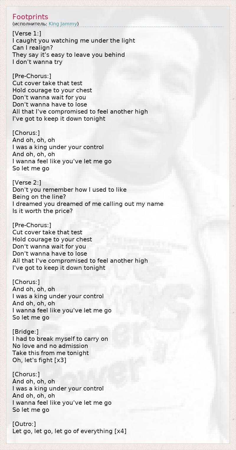 [Verse 1:] I caught you watching me under the light Can I realign? They say it's easy to leave you behind I don't wanna try [Pre-Chorus:] Cut cover take that test Hold courage to your chest Don't wanna wait for you Don't wanna have to lose All that I've compromised to feel another high I've got to keep it down tonight [Chorus:] And oh, oh, oh I was a king under your control And oh, oh, oh I wanna feel like you've let me go So let me go [Verse 2:] Don't you remember how I used to like Being on the line? I dreamed you dreamed of me calling out my name Is it worth the price? [Pre-Chorus:] Cut cover take that test Hold courage to your chest Don't wanna wait for you Don't wanna have to lose All that I've compromised to feel another high I've got to keep it down tonight [Chorus:] And oh, oh, oh I was a king under your control And oh, oh, oh I wanna feel like you've let me go So let me go [Bridge:] I had to break myself to carry on No love and no admission Take this from me tonight Oh, let's fight [x3] [Chorus:] And oh, oh, oh I was a king under your control And oh, oh, oh I wanna feel like you've let me go So let me go [Outro:] Let go, let go, let go of everything [x4]