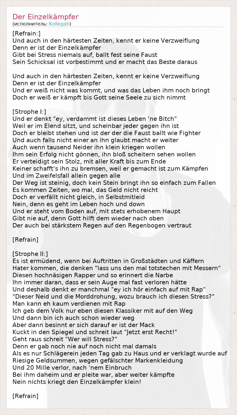 [Refrain:] Und auch in den härtesten Zeiten, kennt er keine Verzweiflung Denn er ist der Einzelkämpfer Gibt bei Stress niemals auf, ballt fest seine Faust Sein Schicksal ist vorbestimmt und er macht das Beste daraus Und auch in den härtesten Zeiten, kennt er keine Verzweiflung Denn er ist der Einzelkämpfer Und er weiß nicht was kommt, und was das Leben ihm noch bringt Doch er weiß er kämpft bis Gott seine Seele zu sich nimmt [Strophe I:] Und er denkt "ey, verdammt ist dieses Leben 'ne Bitch" Weil er im Elend sitzt, und scheinbar jeder gegen ihn ist Doch er bleibt stehen und ist der der die Faust ballt wie Fighter Und auch falls nicht einer an ihn glaubt macht er weiter Auch wenn tausend Neider ihn klein kriegen wollen Ihm sein Erfolg nicht gönnen, ihn bloß scheitern sehen wollen Er verteidigt sein Stolz, mit aller Kraft bis zum Ende Keiner schafft's ihn zu bremsen, weil er gemacht ist zum Kämpfen Und im Zweifelsfall allein gegen alle Der Weg ist steinig, doch kein Stein bringt ihn so einfach zum Fallen Es kommen Zeiten, wo mal, das Geld nicht reicht Doch er verfällt nicht gleich, in Selbstmitleid Nein, denn es geht im Leben hoch und down Und er steht vom Boden auf, mit stets erhobenem Haupt Gibt nie auf, denn Gott hilft dem wieder nach oben Der auch bei stärkstem Regen auf den Regenbogen vertraut [Refrain] [Strophe II:] Es ist ermüdend, wenn bei Auftritten in Großstädten und Käffern Hater kommen, die denken "lass uns den mal totstechen mit Messern" Diesen hochnäsigen Rapper und so erinnert die Narbe Ihn immer daran, dass er sein Auge mal fast verloren hätte Und deshalb denkt er manchmal "ey ich hör einfach auf mit Rap" "Dieser Neid und die Morddrohung, wozu brauch ich diesen Stress?" Man kann eh kaum verdienen mit Rap Ich geb dem Volk nur eben diesen Klassiker mit auf den Weg Und dann bin ich auch schon wieder weg Aber dann besinnt er sich darauf er ist der Mack Kuckt in den Spiegel und schreit laut "Jetzt erst Recht!" Geht raus schreit "Wer will Stress?" Denn er gab noch nie auf noch nicht mal damals Als es nur Schlägerein jeden Tag gab zu Haus und er verklagt wurde auf Riesige Geldsummen, wegen gefälschter Markenkleidung Und 20 Mille verlor, nach 'nem Einbruch Bei ihm daheim und er pleite war, aber weiter kämpfte Nein nichts kriegt den Einzelkämpfer klein! [Refrain]