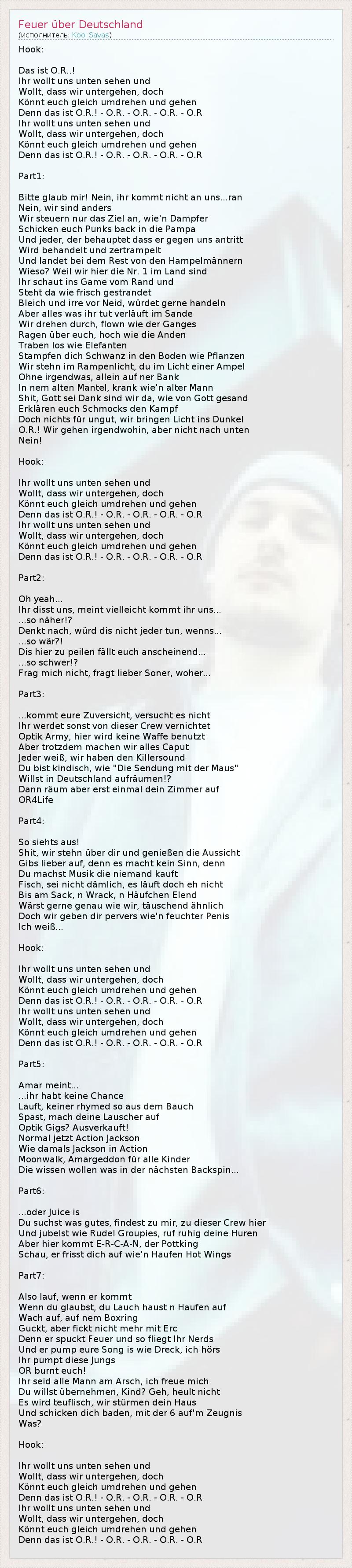 Hook: Das ist O.R..! Ihr wollt uns unten sehen und Wollt, dass wir untergehen, doch Könnt euch gleich umdrehen und gehen Denn das ist O.R.! - O.R. - O.R. - O.R. - O.R Ihr wollt uns unten sehen und Wollt, dass wir untergehen, doch Könnt euch gleich umdrehen und gehen Denn das ist O.R.! - O.R. - O.R. - O.R. - O.R Part1: Bitte glaub mir! Nein, ihr kommt nicht an uns...ran Nein, wir sind anders Wir steuern nur das Ziel an, wie'n Dampfer Schicken euch Punks back in die Pampa Und jeder, der behauptet dass er gegen uns antritt Wird behandelt und zertrampelt Und landet bei dem Rest von den Hampelmännern Wieso? Weil wir hier die Nr. 1 im Land sind Ihr schaut ins Game vom Rand und Steht da wie frisch gestrandet Bleich und irre vor Neid, würdet gerne handeln Aber alles was ihr tut verläuft im Sande Wir drehen durch, flown wie der Ganges Ragen über euch, hoch wie die Anden Traben los wie Elefanten Stampfen dich Schwanz in den Boden wie Pflanzen Wir stehn im Rampenlicht, du im Licht einer Ampel Ohne irgendwas, allein auf ner Bank In nem alten Mantel, krank wie'n alter Mann Shit, Gott sei Dank sind wir da, wie von Gott gesand Erklären euch Schmocks den Kampf Doch nichts für ungut, wir bringen Licht ins Dunkel O.R.! Wir gehen irgendwohin, aber nicht nach unten Nein! Hook: Ihr wollt uns unten sehen und Wollt, dass wir untergehen, doch Könnt euch gleich umdrehen und gehen Denn das ist O.R.! - O.R. - O.R. - O.R. - O.R Ihr wollt uns unten sehen und Wollt, dass wir untergehen, doch Könnt euch gleich umdrehen und gehen Denn das ist O.R.! - O.R. - O.R. - O.R. - O.R Part2: Oh yeah... Ihr disst uns, meint vielleicht kommt ihr uns... ...so näher!? Denkt nach, würd dis nicht jeder tun, wenns... ...so wär?! Dis hier zu peilen fällt euch anscheinend... ...so schwer!? Frag mich nicht, fragt lieber Soner, woher... Part3: ...kommt eure Zuversicht, versucht es nicht Ihr werdet sonst von dieser Crew vernichtet Optik Army, hier wird keine Waffe benutzt Aber trotzdem machen wir alles Caput Jeder weiß, wir haben den Killersound Du bist kindisch, wie "Die Sendung mit der Maus" Willst in Deutschland aufräumen!? Dann räum aber erst einmal dein Zimmer auf OR4Life Part4: So siehts aus! Shit, wir stehn über dir und genießen die Aussicht Gibs lieber auf, denn es macht kein Sinn, denn Du machst Musik die niemand kauft Fisch, sei nicht dämlich, es läuft doch eh nicht Bis am Sack, n Wrack, n Häufchen Elend Wärst gerne genau wie wir, täuschend ähnlich Doch wir geben dir pervers wie'n feuchter Penis Ich weiß... Hook: Ihr wollt uns unten sehen und Wollt, dass wir untergehen, doch Könnt euch gleich umdrehen und gehen Denn das ist O.R.! - O.R. - O.R. - O.R. - O.R Ihr wollt uns unten sehen und Wollt, dass wir untergehen, doch Könnt euch gleich umdrehen und gehen Denn das ist O.R.! - O.R. - O.R. - O.R. - O.R Part5: Amar meint... ...ihr habt keine Chance Lauft, keiner rhymed so aus dem Bauch Spast, mach deine Lauscher auf Optik Gigs? Ausverkauft! Normal jetzt Action Jackson Wie damals Jackson in Action Moonwalk, Amargeddon für alle Kinder Die wissen wollen was in der nächsten Backspin... Part6: ...oder Juice is Du suchst was gutes, findest zu mir, zu dieser Crew hier Und jubelst wie Rudel Groupies, ruf ruhig deine Huren Aber hier kommt E-R-C-A-N, der Pottking Schau, er frisst dich auf wie'n Haufen Hot Wings Part7: Also lauf, wenn er kommt Wenn du glaubst, du Lauch haust n Haufen auf Wach auf, auf nem Boxring Guckt, aber fickt nicht mehr mit Erc Denn er spuckt Feuer und so fliegt Ihr Nerds Und er pump eure Song is wie Dreck, ich hörs Ihr pumpt diese Jungs OR burnt euch! Ihr seid alle Mann am Arsch, ich freue mich Du willst übernehmen, Kind? Geh, heult nicht Es wird teuflisch, wir stürmen dein Haus Und schicken dich baden, mit der 6 auf'm Zeugnis Was? Hook: Ihr wollt uns unten sehen und Wollt, dass wir untergehen, doch Könnt euch gleich umdrehen und gehen Denn das ist O.R.! - O.R. - O.R. - O.R. - O.R Ihr wollt uns unten sehen und Wollt, dass wir untergehen, doch Könnt euch gleich umdrehen und gehen Denn das ist O.R.! - O.R. - O.R. - O.R. - O.R
