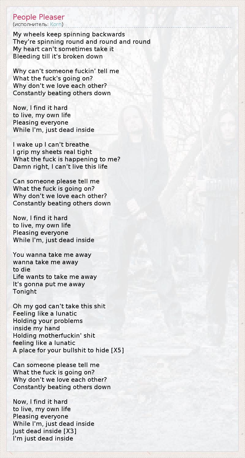 My wheels keep spinning backwards They're spinning round and round and round My heart can't sometimes take it Bleeding till it's broken down Why can't someone fuckin' tell me What the fuck's going on? Why don't we love each other? Constantly beating others down Now, I find it hard to live, my own life Pleasing everyone While I'm, just dead inside I wake up I can't breathe I grip my sheets real tight What the fuck is happening to me? Damn right, I can't live this life Can someone please tell me What the fuck is going on? Why don't we love each other? Constantly beating others down Now, I find it hard to live, my own life Pleasing everyone While I'm, just dead inside You wanna take me away wanna take me away to die Life wants to take me away It's gonna put me away Tonight Oh my god can't take this shit Feeling like a lunatic Holding your problems inside my hand Holding motherfuckin' shit feeling like a lunatic A place for your bullshit to hide [X5] Can someone please tell me What the fuck is going on? Why don't we love each other? Constantly beating others down Now, I find it hard to live, my own life Pleasing everyone While I'm, just dead inside Just dead inside [X3] I'm just dead inside
