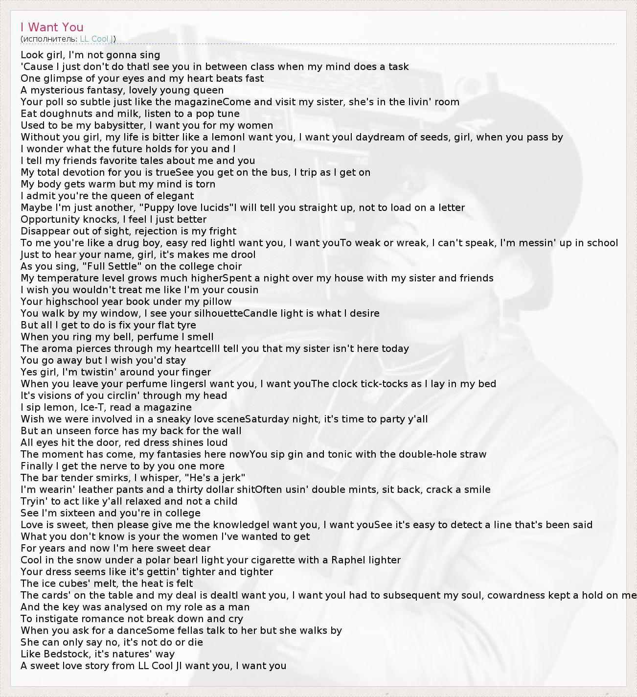 Look girl, I'm not gonna sing 'Cause I just don't do thatI see you in between class when my mind does a task One glimpse of your eyes and my heart beats fast A mysterious fantasy, lovely young queen Your poll so subtle just like the magazineCome and visit my sister, she's in the livin' room Eat doughnuts and milk, listen to a pop tune Used to be my babysitter, I want you for my women Without you girl, my life is bitter like a lemonI want you, I want youI daydream of seeds, girl, when you pass by I wonder what the future holds for you and I I tell my friends favorite tales about me and you My total devotion for you is trueSee you get on the bus, I trip as I get on My body gets warm but my mind is torn I admit you're the queen of elegant Maybe I'm just another, "Puppy love lucids"I will tell you straight up, not to load on a letter Opportunity knocks, I feel I just better Disappear out of sight, rejection is my fright To me you're like a drug boy, easy red lightI want you, I want youTo weak or wreak, I can't speak, I'm messin' up in school Just to hear your name, girl, it's makes me drool As you sing, "Full Settle" on the college choir My temperature level grows much higherSpent a night over my house with my sister and friends I wish you wouldn't treat me like I'm your cousin Your highschool year book under my pillow You walk by my window, I see your silhouetteCandle light is what I desire But all I get to do is fix your flat tyre When you ring my bell, perfume I smell The aroma pierces through my heartcellI tell you that my sister isn't here today You go away but I wish you'd stay Yes girl, I'm twistin' around your finger When you leave your perfume lingersI want you, I want youThe clock tick-tocks as I lay in my bed It's visions of you circlin' through my head I sip lemon, Ice-T, read a magazine Wish we were involved in a sneaky love sceneSaturday night, it's time to party y'all But an unseen force has my back for the wall All eyes hit the door, red dress shines loud The moment has come, my fantasies here nowYou sip gin and tonic with the double-hole straw Finally I get the nerve to by you one more The bar tender smirks, I whisper, "He's a jerk" I'm wearin' leather pants and a thirty dollar shitOften usin' double mints, sit back, crack a smile Tryin' to act like y'all relaxed and not a child See I'm sixteen and you're in college Love is sweet, then please give me the knowledgeI want you, I want youSee it's easy to detect a line that's been said What you don't know is your the women I've wanted to get For years and now I'm here sweet dear Cool in the snow under a polar bearI light your cigarette with a Raphel lighter Your dress seems like it's gettin' tighter and tighter The ice cubes' melt, the heat is felt The cards' on the table and my deal is dealtI want you, I want youI had to subsequent my soul, cowardness kept a hold on me And the key was analysed on my role as a man To instigate romance not break down and cry When you ask for a danceSome fellas talk to her but she walks by She can only say no, it's not do or die Like Bedstock, it's natures' way A sweet love story from LL Cool JI want you, I want you