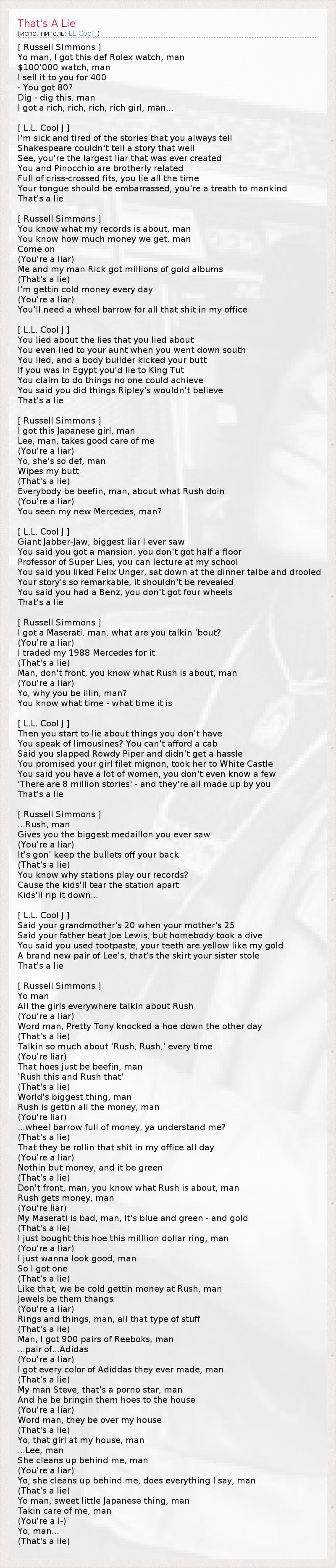 [ Russell Simmons ] Yo man, I got this def Rolex watch, man $100'000 watch, man I sell it to you for 400 - You got 80? Dig - dig this, man I got a rich, rich, rich, rich girl, man... [ L.L. Cool J ] I'm sick and tired of the stories that you always tell Shakespeare couldn't tell a story that well See, you're the largest liar that was ever created You and Pinocchio are brotherly related Full of criss-crossed fits, you lie all the time Your tongue should be embarrassed, you're a treath to mankind That's a lie [ Russell Simmons ] You know what my records is about, man You know how much money we get, man Come on (You're a liar) Me and my man Rick got millions of gold albums (That's a lie) I'm gettin cold money every day (You're a liar) You'll need a wheel barrow for all that shit in my office [ L.L. Cool J ] You lied about the lies that you lied about You even lied to your aunt when you went down south You lied, and a body builder kicked your butt If you was in Egypt you'd lie to King Tut You claim to do things no one could achieve You said you did things Ripley's wouldn't believe That's a lie [ Russell Simmons ] I got this Japanese girl, man Lee, man, takes good care of me (You're a liar) Yo, she's so def, man Wipes my butt (That's a lie) Everybody be beefin, man, about what Rush doin (You're a liar) You seen my new Mercedes, man? [ L.L. Cool J ] Giant Jabber-Jaw, biggest liar I ever saw You said you got a mansion, you don't got half a floor Professor of Super Lies, you can lecture at my school You said you liked Felix Unger, sat down at the dinner talbe and drooled Your story's so remarkable, it shouldn't be revealed You said you had a Benz, you don't got four wheels That's a lie [ Russell Simmons ] I got a Maserati, man, what are you talkin 'bout? (You're a liar) I traded my 1988 Mercedes for it (That's a lie) Man, don't front, you know what Rush is about, man (You're a liar) Yo, why you be illin, man? You know what time - what time it is [ L.L. Cool J ] Then you start to lie about things you don't have You speak of limousines? You can't afford a cab Said you slapped Rowdy Piper and didn't get a hassle You promised your girl filet mignon, took her to White Castle You said you have a lot of women, you don't even know a few 'There are 8 million stories' - and they're all made up by you That's a lie [ Russell Simmons ] ...Rush, man Gives you the biggest medaillon you ever saw (You're a liar) It's gon' keep the bullets off your back (That's a lie) You know why stations play our records? Cause the kids'll tear the station apart Kids'll rip it down... [ L.L. Cool J ] Said your grandmother's 20 when your mother's 25 Said your father beat Joe Lewis, but homebody took a dive You said you used tootpaste, your teeth are yellow like my gold A brand new pair of Lee's, that's the skirt your sister stole That's a lie [ Russell Simmons ] Yo man All the girls everywhere talkin about Rush (You're a liar) Word man, Pretty Tony knocked a hoe down the other day (That's a lie) Talkin so much about 'Rush, Rush,' every time (You're liar) That hoes just be beefin, man 'Rush this and Rush that' (That's a lie) World's biggest thing, man Rush is gettin all the money, man (You're liar) ...wheel barrow full of money, ya understand me? (That's a lie) That they be rollin that shit in my office all day (You're a liar) Nothin but money, and it be green (That's a lie) Don't front, man, you know what Rush is about, man Rush gets money, man (You're liar) My Maserati is bad, man, it's blue and green - and gold (That's a lie) I just bought this hoe this milllion dollar ring, man (You're a liar) I just wanna look good, man So I got one (That's a lie) Like that, we be cold gettin money at Rush, man Jewels be them thangs (You're a liar) Rings and things, man, all that type of stuff (That's a lie) Man, I got 900 pairs of Reeboks, man ...pair of...Adidas (You're a liar) I got every color of Adiddas they ever made, man (That's a lie) My man Steve, that's a porno star, man And he be bringin them hoes to the house (You're a liar) Word man, they be over my house (That's a lie) Yo, that girl at my house, man ...Lee, man She cleans up behind me, man (You're a liar) Yo, she cleans up behind me, does everything I say, man (That's a lie) Yo man, sweet little Japanese thing, man Takin care of me, man (You're a l-) Yo, man... (That's a lie)