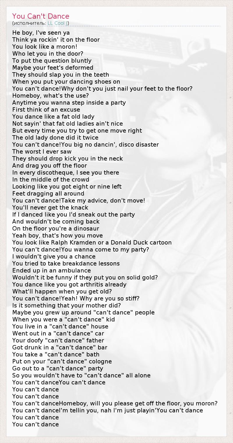 He boy, I've seen ya Think ya rockin' it on the floor You look like a moron! Who let you in the door? To put the question bluntly Maybe your feet's deformed They should slap you in the teeth When you put your dancing shoes on You can't dance!Why don't you just nail your feet to the floor? Homeboy, what's the use? Anytime you wanna step inside a party First think of an excuse You dance like a fat old lady Not sayin' that fat old ladies ain't nice But every time you try to get one move right The old lady done did it twice You can't dance!You big no dancin', disco disaster The worst I ever saw They should drop kick you in the neck And drag you off the floor In every discotheque, I see you there In the middle of the crowd Looking like you got eight or nine left Feet dragging all around You can't dance!Take my advice, don't move! You'll never get the knack If I danced like you I'd sneak out the party And wouldn't be coming back On the floor you're a dinosaur Yeah boy, that's how you move You look like Ralph Kramden or a Donald Duck cartoon You can't dance!You wanna come to my party? I wouldn't give you a chance You tried to take breakdance lessons Ended up in an ambulance Wouldn't it be funny if they put you on solid gold? You dance like you got arthritis already What'll happen when you get old? You can't dance!Yeah! Why are you so stiff? Is it something that your mother did? Maybe you grew up around "can't dance" people When you were a "can't dance" kid You live in a "can't dance" house Went out in a "can't dance" car Your doofy "can't dance" father Got drunk in a "can't dance" bar You take a "can't dance" bath Put on your "can't dance" cologne Go out to a "can't dance" party So you wouldn't have to "can't dance" all alone You can't danceYou can't dance You can't dance You can't dance You can't danceHomeboy, will you please get off the floor, you moron? You can't danceI'm tellin you, nah I'm just playin'You can't dance You can't dance You can't dance