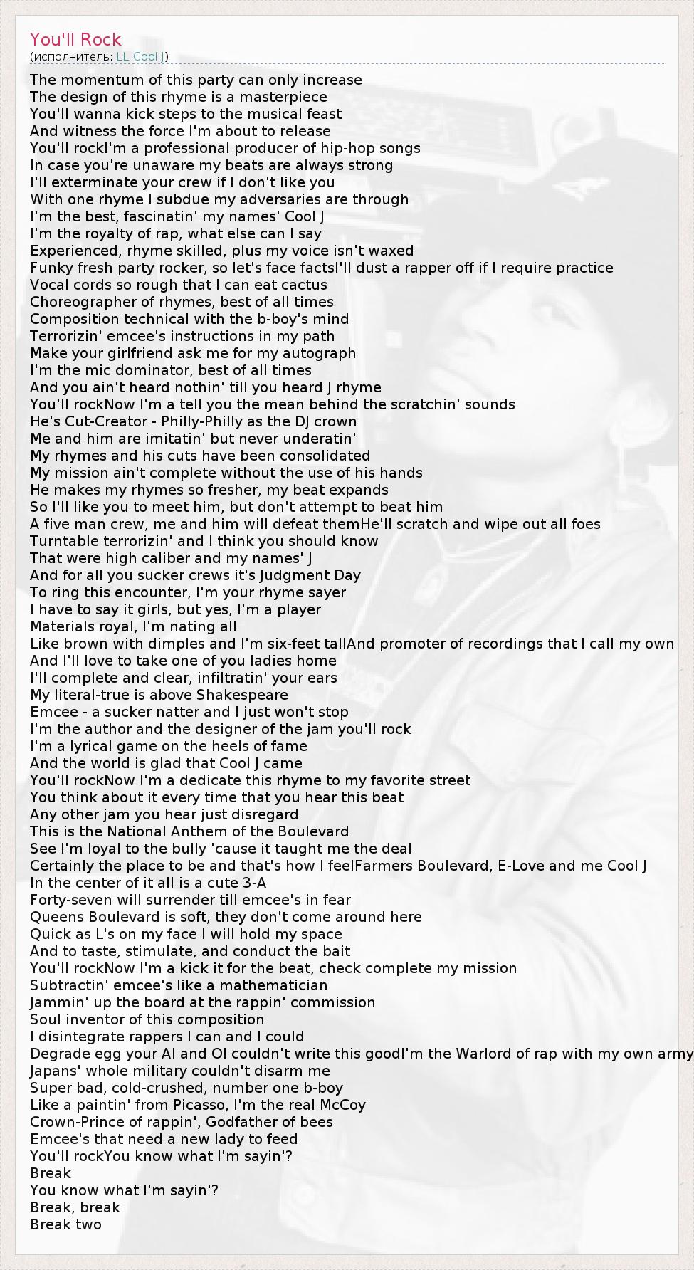 The momentum of this party can only increase The design of this rhyme is a masterpiece You'll wanna kick steps to the musical feast And witness the force I'm about to release You'll rockI'm a professional producer of hip-hop songs In case you're unaware my beats are always strong I'll exterminate your crew if I don't like you With one rhyme I subdue my adversaries are through I'm the best, fascinatin' my names' Cool J I'm the royalty of rap, what else can I say Experienced, rhyme skilled, plus my voice isn't waxed Funky fresh party rocker, so let's face factsI'll dust a rapper off if I require practice Vocal cords so rough that I can eat cactus Choreographer of rhymes, best of all times Composition technical with the b-boy's mind Terrorizin' emcee's instructions in my path Make your girlfriend ask me for my autograph I'm the mic dominator, best of all times And you ain't heard nothin' till you heard J rhyme You'll rockNow I'm a tell you the mean behind the scratchin' sounds He's Cut-Creator - Philly-Philly as the DJ crown Me and him are imitatin' but never underatin' My rhymes and his cuts have been consolidated My mission ain't complete without the use of his hands He makes my rhymes so fresher, my beat expands So I'll like you to meet him, but don't attempt to beat him A five man crew, me and him will defeat themHe'll scratch and wipe out all foes Turntable terrorizin' and I think you should know That were high caliber and my names' J And for all you sucker crews it's Judgment Day To ring this encounter, I'm your rhyme sayer I have to say it girls, but yes, I'm a player Materials royal, I'm nating all Like brown with dimples and I'm six-feet tallAnd promoter of recordings that I call my own And I'll love to take one of you ladies home I'll complete and clear, infiltratin' your ears My literal-true is above Shakespeare Emcee - a sucker natter and I just won't stop I'm the author and the designer of the jam you'll rock I'm a lyrical game on the heels of fame And the world is glad that Cool J came You'll rockNow I'm a dedicate this rhyme to my favorite street You think about it every time that you hear this beat Any other jam you hear just disregard This is the National Anthem of the Boulevard See I'm loyal to the bully 'cause it taught me the deal Certainly the place to be and that's how I feelFarmers Boulevard, E-Love and me Cool J In the center of it all is a cute 3-A Forty-seven will surrender till emcee's in fear Queens Boulevard is soft, they don't come around here Quick as L's on my face I will hold my space And to taste, stimulate, and conduct the bait You'll rockNow I'm a kick it for the beat, check complete my mission Subtractin' emcee's like a mathematician Jammin' up the board at the rappin' commission Soul inventor of this composition I disintegrate rappers I can and I could Degrade egg your Al and Ol couldn't write this goodI'm the Warlord of rap with my own army Japans' whole military couldn't disarm me Super bad, cold-crushed, number one b-boy Like a paintin' from Picasso, I'm the real McCoy Crown-Prince of rappin', Godfather of bees Emcee's that need a new lady to feed You'll rockYou know what I'm sayin'? Break You know what I'm sayin'? Break, break Break two