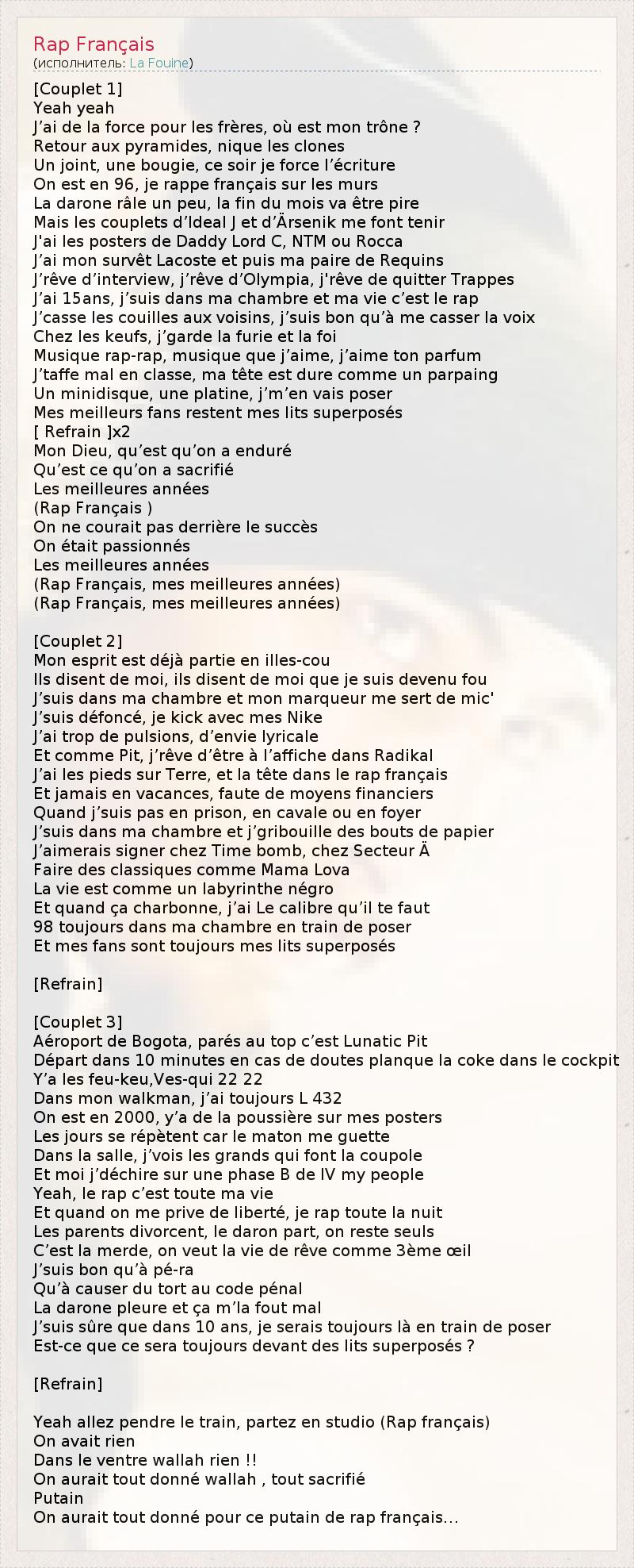[Couplet 1] Yeah yeah J’ai de la force pour les frères, où est mon trône ? Retour aux pyramides, nique les clones Un joint, une bougie, ce soir je force l’écriture On est en 96, je rappe français sur les murs La darone râle un peu, la fin du mois va être pire Mais les couplets d’Ideal J et d’Ärsenik me font tenir J'ai les posters de Daddy Lord C, NTM ou Rocca J’ai mon survêt Lacoste et puis ma paire de Requins J’rêve d’interview, j’rêve d’Olympia, j'rêve de quitter Trappes J’ai 15ans, j’suis dans ma chambre et ma vie c’est le rap J’casse les couilles aux voisins, j’suis bon qu’à me casser la voix Chez les keufs, j’garde la furie et la foi Musique rap-rap, musique que j’aime, j’aime ton parfum J’taffe mal en classe, ma tête est dure comme un parpaing Un minidisque, une platine, j’m’en vais poser Mes meilleurs fans restent mes lits superposés [ Refrain ]x2 Mon Dieu, qu’est qu’on a enduré Qu’est ce qu’on a sacrifié Les meilleures années (Rap Français ) On ne courait pas derrière le succès On était passionnés Les meilleures années (Rap Français, mes meilleures années) (Rap Français, mes meilleures années) [Couplet 2] Mon esprit est déjà partie en illes-cou Ils disent de moi, ils disent de moi que je suis devenu fou J’suis dans ma chambre et mon marqueur me sert de mic' J’suis défoncé, je kick avec mes Nike J’ai trop de pulsions, d’envie lyricale Et comme Pit, j’rêve d’être à l’affiche dans Radikal J’ai les pieds sur Terre, et la tête dans le rap français Et jamais en vacances, faute de moyens financiers Quand j’suis pas en prison, en cavale ou en foyer J’suis dans ma chambre et j’gribouille des bouts de papier J’aimerais signer chez Time bomb, chez Secteur Ä Faire des classiques comme Mama Lova La vie est comme un labyrinthe négro Et quand ça charbonne, j’ai Le calibre qu’il te faut 98 toujours dans ma chambre en train de poser Et mes fans sont toujours mes lits superposés [Refrain] [Couplet 3] Aéroport de Bogota, parés au top c’est Lunatic Pit Départ dans 10 minutes en cas de doutes planque la coke dans le cockpit Y’a les feu-keu,Ves-qui 22 22 Dans mon walkman, j’ai toujours L 432 On est en 2000, y’a de la poussière sur mes posters Les jours se répètent car le maton me guette Dans la salle, j’vois les grands qui font la coupole Et moi j’déchire sur une phase B de IV my people Yeah, le rap c’est toute ma vie Et quand on me prive de liberté, je rap toute la nuit Les parents divorcent, le daron part, on reste seuls C’est la merde, on veut la vie de rêve comme 3ème œil J’suis bon qu’à pé-ra Qu’à causer du tort au code pénal La darone pleure et ça m’la fout mal J’suis sûre que dans 10 ans, je serais toujours là en train de poser Est-ce que ce sera toujours devant des lits superposés ? [Refrain] Yeah allez pendre le train, partez en studio (Rap français) On avait rien Dans le ventre wallah rien !! On aurait tout donné wallah , tout sacrifié Putain On aurait tout donné pour ce putain de rap français…
