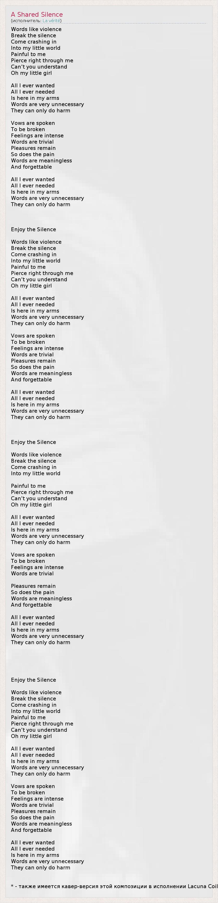 Words like violence Break the silence Come crashing in Into my little world Painful to me Pierce right through me Can't you understand Oh my little girl All I ever wanted All I ever needed Is here in my arms Words are very unnecessary They can only do harm Vows are spoken To be broken Feelings are intense Words are trivial Pleasures remain So does the pain Words are meaningless And forgettable All I ever wanted All I ever needed Is here in my arms Words are very unnecessary They can only do harm Enjoy the Silence Words like violence Break the silence Come crashing in Into my little world Painful to me Pierce right through me Can't you understand Oh my little girl All I ever wanted All I ever needed Is here in my arms Words are very unnecessary They can only do harm Vows are spoken To be broken Feelings are intense Words are trivial Pleasures remain So does the pain Words are meaningless And forgettable All I ever wanted All I ever needed Is here in my arms Words are very unnecessary They can only do harm Enjoy the Silence Words like violence Break the silence Come crashing in Into my little world Painful to me Pierce right through me Can't you understand Oh my little girl All I ever wanted All I ever needed Is here in my arms Words are very unnecessary They can only do harm Vows are spoken To be broken Feelings are intense Words are trivial Pleasures remain So does the pain Words are meaningless And forgettable All I ever wanted All I ever needed Is here in my arms Words are very unnecessary They can only do harm Enjoy the Silence Words like violence Break the silence Come crashing in Into my little world Painful to me Pierce right through me Can't you understand Oh my little girl All I ever wanted All I ever needed Is here in my arms Words are very unnecessary They can only do harm Vows are spoken To be broken Feelings are intense Words are trivial Pleasures remain So does the pain Words are meaningless And forgettable All I ever wanted All I ever needed Is here in my arms Words are very unnecessary They can only do harm * - также имеется кавер-версия этой композиции в исполнении Lacuna Coil