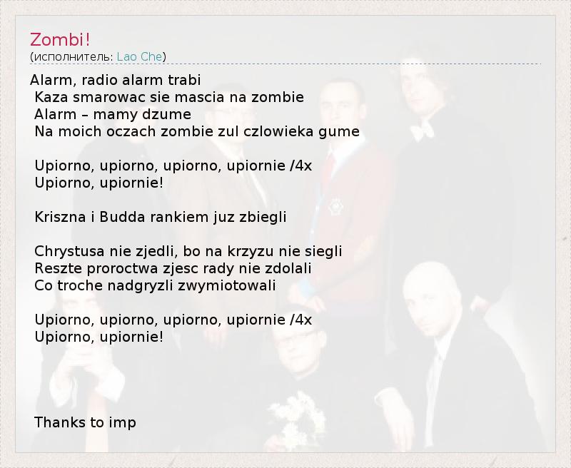 Это интересно:Польская группа Lao Che образовалась в 1999 году. Её основу составили музыканты коллектива Koli. Жанр, в котором играют музыканты чётко определить нельзя. Их музыка - смесь альтернативы, панк-рока, ска, фолка и амбиента.Свою популярность ребята обрели благодаря альбому Powstanie Warszawskie (Варшавское восстание).Сейчас в Lao Che играют: * Mariusz "Denat" Denst (сэмплы) * Hubert "Spięty" Dobaczewski (вокал,... продолжение