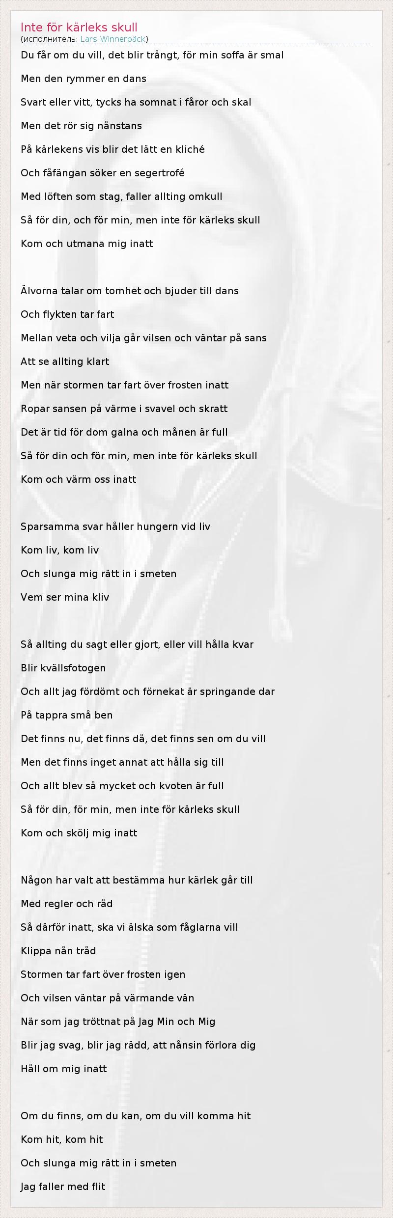 А как ты думаешь, о чем песня "Inte för kärleks skull" ?