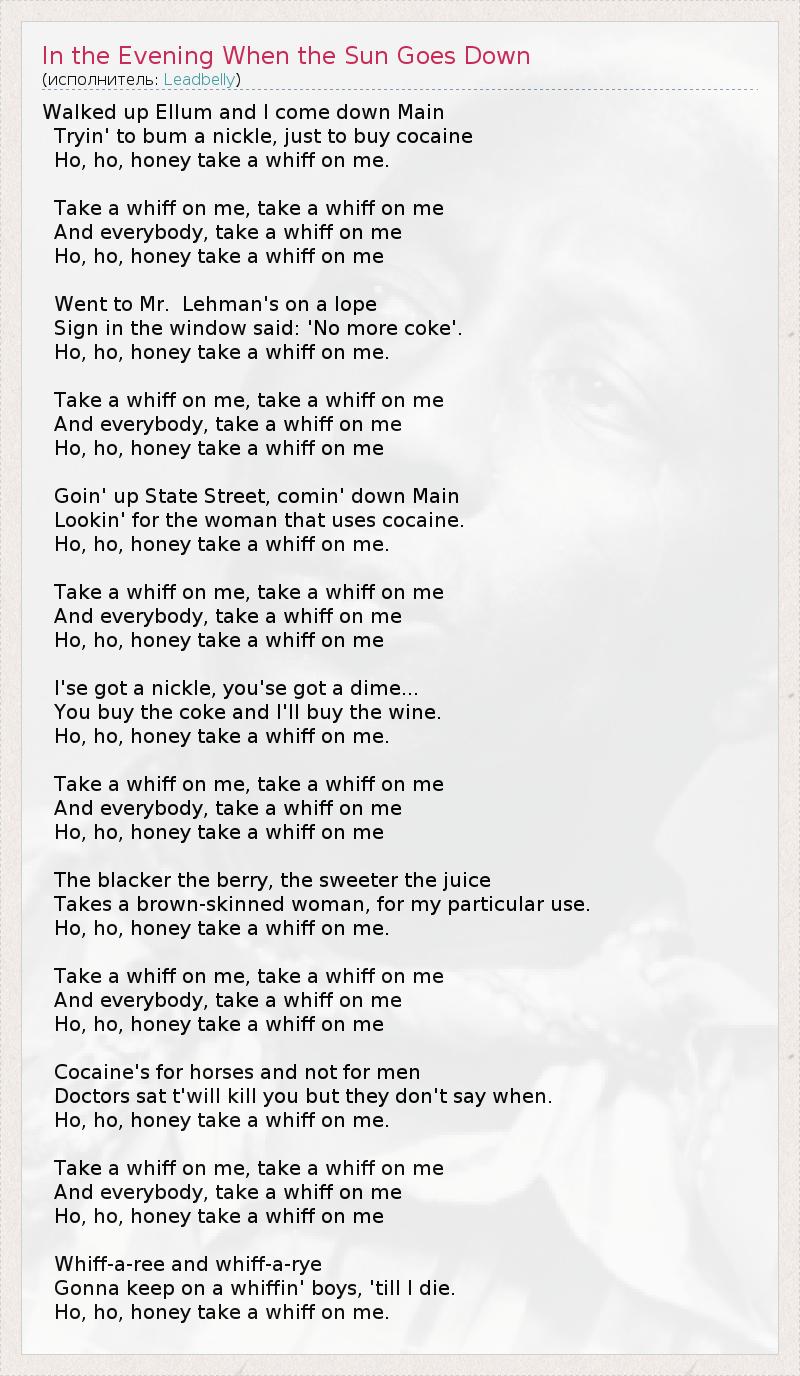 ГлавнаяИсполнителиLeadbellyIn the Evening When the Sun Goes Down