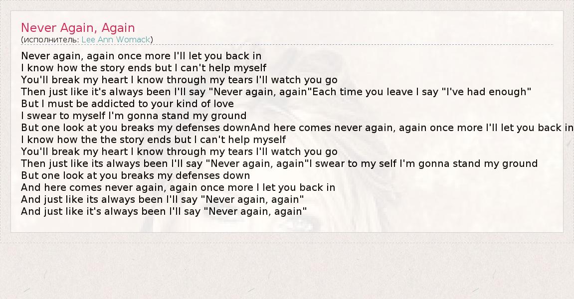 Never again, again once more I'll let you back in I know how the story ends but I can't help myself You'll break my heart I know through my tears I'll watch you go Then just like it's always been I'll say "Never again, again"Each time you leave I say "I've had enough" But I must be addicted to your kind of love I swear to myself I'm gonna stand my ground But one look at you breaks my defenses downAnd here comes never again, again once more I'll let you back in I know how the the story ends but I can't help myself You'll break my heart I know through my tears I'll watch you go Then just like its always been I'll say "Never again, again"I swear to my self I'm gonna stand my ground But one look at you breaks my defenses down And here comes never again, again once more I let you back in And just like its always been I'll say "Never again, again" And just like it's always been I'll say "Never again, again"