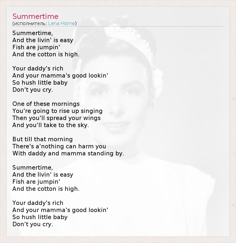 Это интересно:Настоящее имя Lena Calhoun Horne.June 30, 1917 – May 9, 2010Лина Хорн родилась в Бруклине. Ее мать, Эдна, хотела, чтобы Лина пошла в шоу-бизнес и когда дочери было 16 лет, устроила ее петь в хоре Cotton Club в Гарлеме. Лина оставила школу и стала кормильцем семьи, зарабатывая 25$ в неделю. Она вышла замуж за молодого Льюиса Джонса и в возрасте 20 лет родила ему дочь и сына (который умер от почечной недостаточности... продолжение