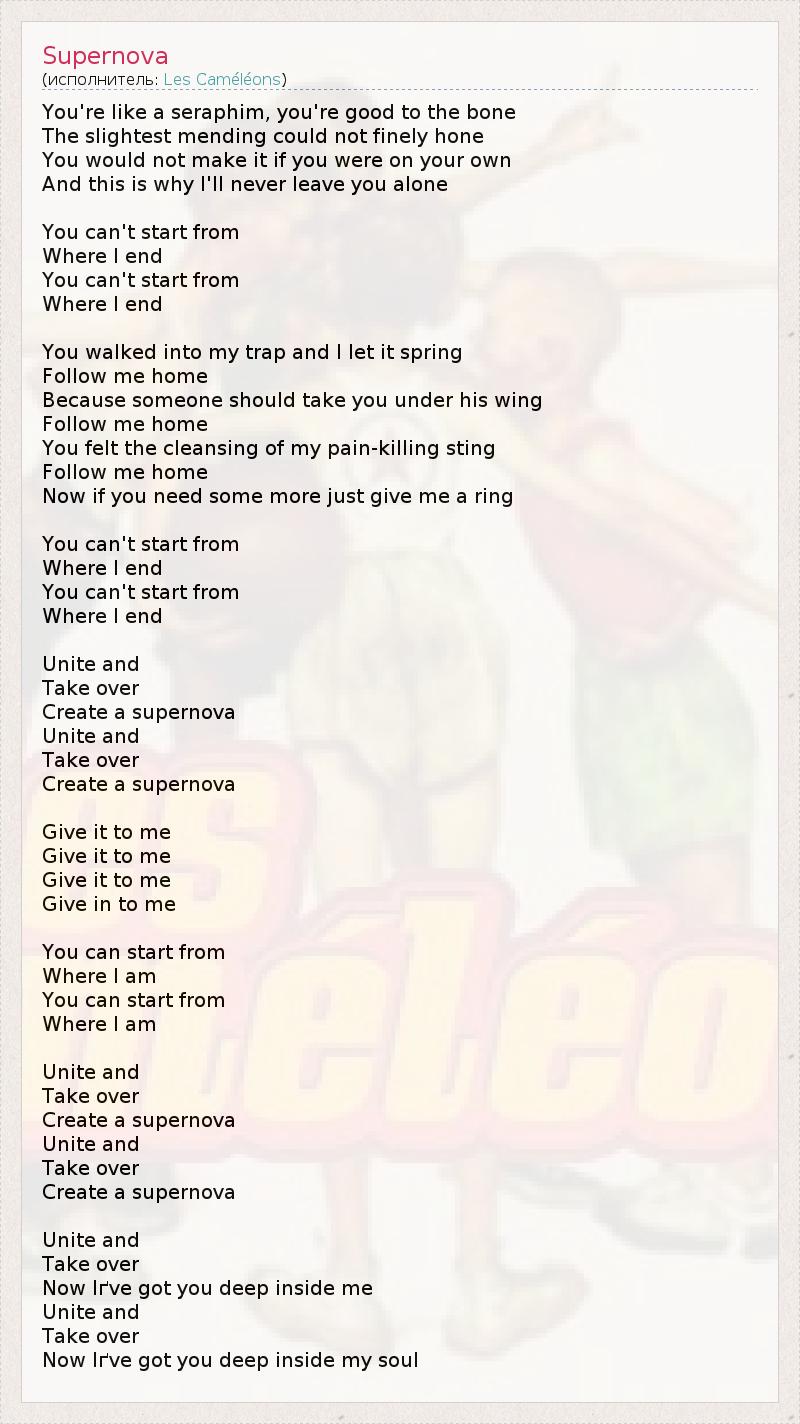 Ты как серафим, неисправимо хорошая, И ничто не изменит тебя, Ты не смогла бы сделать этого сама, И поэтому я никогда тебя не оставлю! Ты не можешь начать там, Где я заканчиваю… Ты попалась в мою ловушку, но я отпустил тебя, (Идем со мной домой…) Потому что кто-то должен был взять тебя под крыло. (Идем со мной домой…) Ты чувствовала очищение от моего убивающего боль жала, (Идем со мной домой…) И если тебе нужно еще, только дай мне знать! Ты не можешь начать там, Где я заканчиваю… Объединяйтесь и преодолевайте, Создавайте сверхновую звезду! Отдайте ее мне! Ты не можешь начать там, Где я… Объединяйтесь и преодолевайте, Создавайте сверхновую звезду! Объединяйтесь и преодолевайте... Теперь ты глубоко внутри меня! Объединяйтесь и преодолевайте... Теперь ты глубоко в моей душе