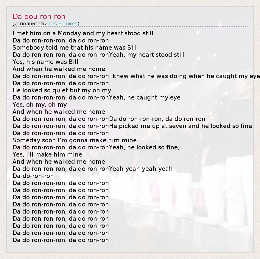 I met him on a Monday and my heart stood still Da do ron-ron-ron, da do ron-ron Somebody told me that his name was Bill Da do ron-ron-ron, da do ron-ronYeah, my heart stood still Yes, his name was Bill And when he walked me home Da do ron-ron-ron, da do ron-ronI knew what he was doing when he caught my eye Da do ron-ron-ron, da do ron-ron He looked so quiet but my oh my Da do ron-ron-ron, da do ron-ronYeah, he caught my eye Yes, oh my, oh my And when he walked me home Da do ron-ron-ron, da do ron-ronDa do ron-ron-ron, da do ron-ron Da do ron-ron-ron, da do ron-ronHe picked me up at seven and he looked so fine Da do ron-ron-ron, da do ron-ron Someday soon I'm gonna make him mine Da do ron-ron-ron, da do ron-ronYeah, he looked so fine, Yes, I'll make him mine And when he walked me home Da do ron-ron-ron, da do ron-ronYeah-yeah-yeah-yeah Da-do-ron-ron Da do ron-ron-ron, da do ron-ron Da do ron-ron-ron, da do ron-ron Da do ron-ron-ron, da do ron-ron Da do ron-ron-ron, da do ron-ron Da do ron-ron-ron, da do ron-ron Da do ron-ron-ron, da do ron-ron Da do ron-ron-ron, da do ron-ron Da do ron-ron-ron, da do ron-ron Da do ron-ron-ron, da do ron-ron