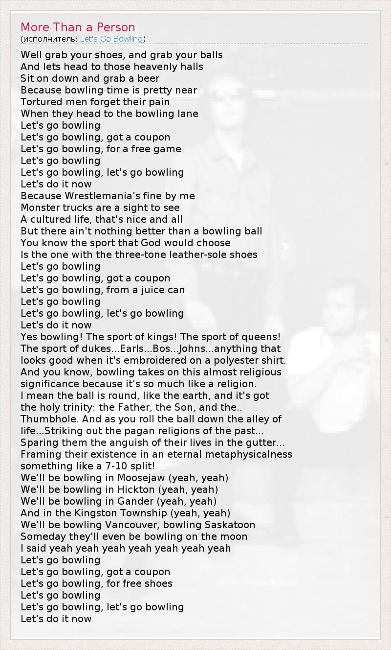 Well grab your shoes, and grab your balls And lets head to those heavenly halls Sit on down and grab a beer Because bowling time is pretty near Tortured men forget their pain When they head to the bowling lane Let's go bowling Let's go bowling, got a coupon Let's go bowling, for a free game Let's go bowling Let's go bowling, let's go bowling Let's do it now Because Wrestlemania's fine by me Monster trucks are a sight to see A cultured life, that's nice and all But there ain't nothing better than a bowling ball You know the sport that God would choose Is the one with the three-tone leather-sole shoes Let's go bowling Let's go bowling, got a coupon Let's go bowling, from a juice can Let's go bowling Let's go bowling, let's go bowling Let's do it now Yes bowling! The sport of kings! The sport of queens! The sport of dukes...Earls...Bos...Johns...anything that looks good when it's embroidered on a polyester shirt. And you know, bowling takes on this almost religious significance because it's so much like a religion. I mean the ball is round, like the earth, and it's got the holy trinity: the Father, the Son, and the.. Thumbhole. And as you roll the ball down the alley of life...Striking out the pagan religions of the past... Sparing them the anguish of their lives in the gutter... Framing their existence in an eternal metaphysicalness something like a 7-10 split! We'll be bowling in Moosejaw (yeah, yeah) We'll be bowling in Hickton (yeah, yeah) We'll be bowling in Gander (yeah, yeah) And in the Kingston Township (yeah, yeah) We'll be bowling Vancouver, bowling Saskatoon Someday they'll even be bowling on the moon I said yeah yeah yeah yeah yeah yeah yeah Let's go bowling Let's go bowling, got a coupon Let's go bowling, for free shoes Let's go bowling Let's go bowling, let's go bowling Let's do it now