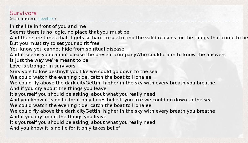 In the life in front of you and me Seems there is no logic, no place that you must be And there are times that it gets so hard to seeTo find the valid reasons for the things that come to be But you must try to set your spirit free You know you cannot hide from spiritual disease And it seems you cannot please the present companyWho could claim to know the answers Is just the way we're meant to be Love is stronger in survivors Survivors follow destinyIf you like we could go down to the sea We could watch the evening tide, catch the boat to Honalee We could fly above the dark cityGettin' higher in the sky with every breath you breathe And if you cry about the things you leave It's yourself you should be asking, about what you really need And you know it is no lie for it only takes beliefIf you like we could go down to the sea We could watch the evening tide, catch the boat to Honalee We could fly above the dark cityGettin' higher in the sky with every breath you breathe And if you cry about the things you leave It's yourself you should be asking, about what you really need And you know it is no lie for it only takes belief
