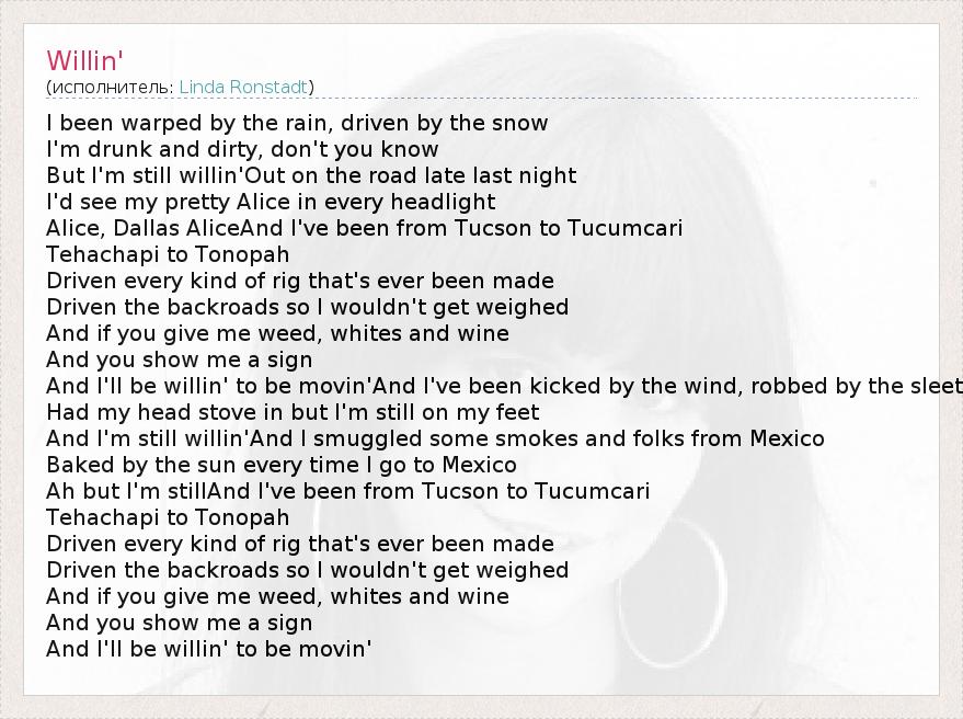 And I'm still willin'And I smuggled some smokes and folks from Mexico