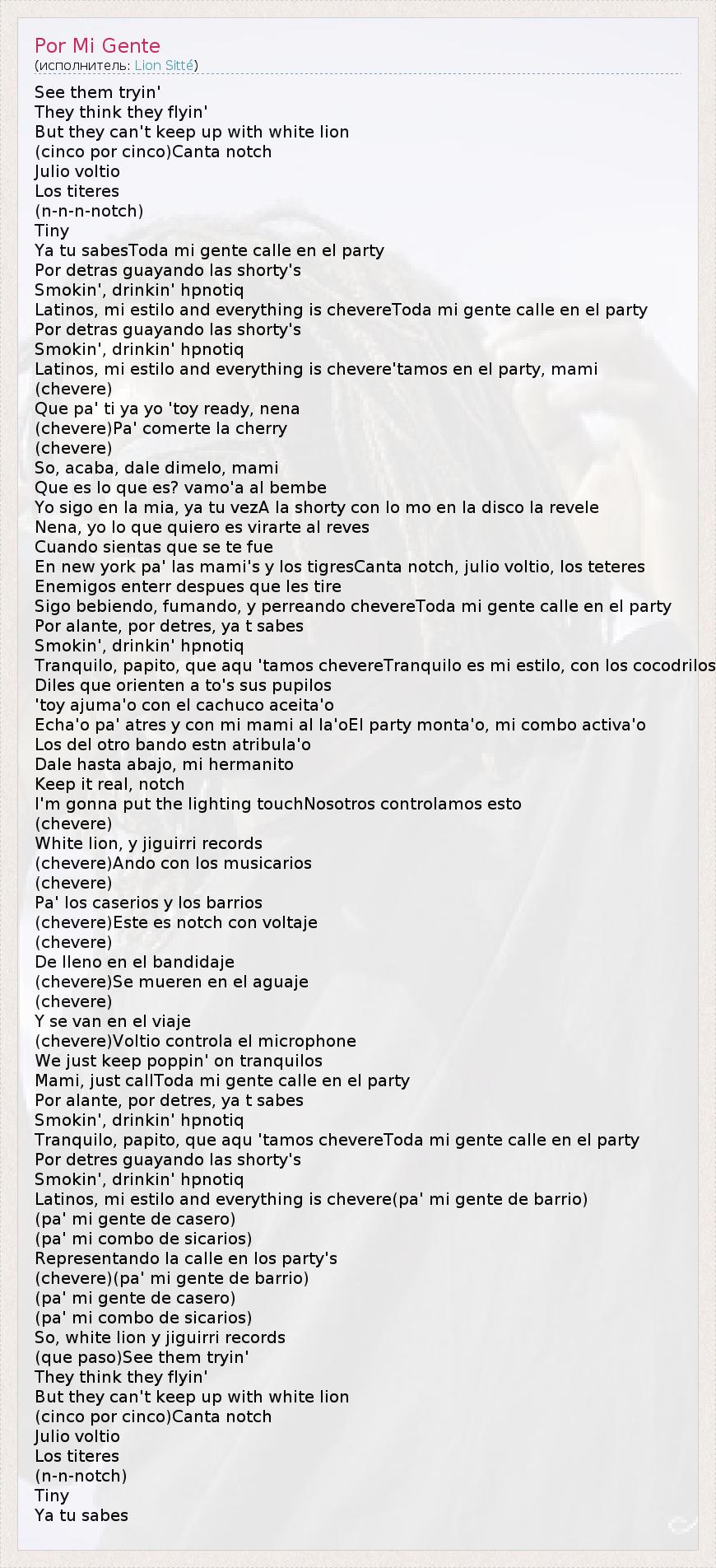 See them tryin' They think they flyin' But they can't keep up with white lion (cinco por cinco)Canta notch Julio voltio Los titeres (n-n-n-notch) Tiny Ya tu sabesToda mi gente calle en el party Por detras guayando las shorty's Smokin', drinkin' hpnotiq Latinos, mi estilo and everything is chevereToda mi gente calle en el party Por detras guayando las shorty's Smokin', drinkin' hpnotiq Latinos, mi estilo and everything is chevere'tamos en el party, mami (chevere) Que pa' ti ya yo 'toy ready, nena (chevere)Pa' comerte la cherry (chevere) So, acaba, dale dimelo, mami Que es lo que es? vamo'a al bembe Yo sigo en la mia, ya tu vezA la shorty con lo mo en la disco la revele Nena, yo lo que quiero es virarte al reves Cuando sientas que se te fue En new york pa' las mami's y los tigresCanta notch, julio voltio, los teteres Enemigos enterr despues que les tire Sigo bebiendo, fumando, y perreando chevereToda mi gente calle en el party Por alante, por detres, ya t sabes Smokin', drinkin' hpnotiq Tranquilo, papito, que aqu 'tamos chevereTranquilo es mi estilo, con los cocodrilos Diles que orienten a to's sus pupilos 'toy ajuma'o con el cachuco aceita'o Echa'o pa' atres y con mi mami al la'oEl party monta'o, mi combo activa'o Los del otro bando estn atribula'o Dale hasta abajo, mi hermanito Keep it real, notch I'm gonna put the lighting touchNosotros controlamos esto (chevere) White lion, y jiguirri records (chevere)Ando con los musicarios (chevere) Pa' los caserios y los barrios (chevere)Este es notch con voltaje (chevere) De lleno en el bandidaje (chevere)Se mueren en el aguaje (chevere) Y se van en el viaje (chevere)Voltio controla el microphone We just keep poppin' on tranquilos Mami, just callToda mi gente calle en el party Por alante, por detres, ya t sabes Smokin', drinkin' hpnotiq Tranquilo, papito, que aqu 'tamos chevereToda mi gente calle en el party Por detres guayando las shorty's Smokin', drinkin' hpnotiq Latinos, mi estilo and everything is chevere(pa' mi gente de barrio) (pa' mi gente de casero) (pa' mi combo de sicarios) Representando la calle en los party's (chevere)(pa' mi gente de barrio) (pa' mi gente de casero) (pa' mi combo de sicarios) So, white lion y jiguirri records (que paso)See them tryin' They think they flyin' But they can't keep up with white lion (cinco por cinco)Canta notch Julio voltio Los titeres (n-n-notch) Tiny Ya tu sabes