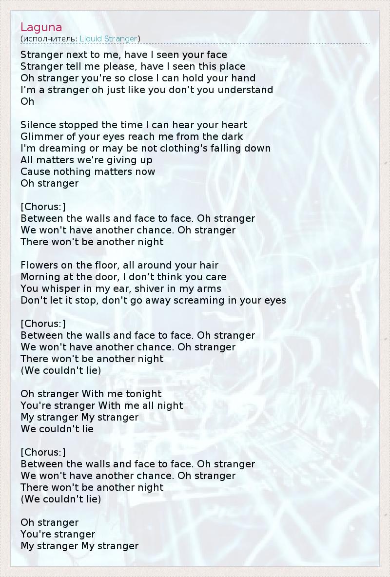 Stranger next to me, have I seen your face Stranger tell me please, have I seen this place Oh stranger you're so close I can hold your hand I'm a stranger oh just like you don't you understand Oh Silence stopped the time I can hear your heart Glimmer of your eyes reach me from the dark I'm dreaming or may be not clothing's falling down All matters we're giving up Cause nothing matters now Oh stranger [Chorus:] Between the walls and face to face. Oh stranger We won't have another chance. Oh stranger There won't be another night Flowers on the floor, all around your hair Morning at the door, I don't think you care You whisper in my ear, shiver in my arms Don't let it stop, don't go away screaming in your eyes [Chorus:] Between the walls and face to face. Oh stranger We won't have another chance. Oh stranger There won't be another night (We couldn't lie) Oh stranger With me tonight You're stranger With me all night My stranger My stranger We couldn't lie [Chorus:] Between the walls and face to face. Oh stranger We won't have another chance. Oh stranger There won't be another night (We couldn't lie) Oh stranger You're stranger My stranger My stranger