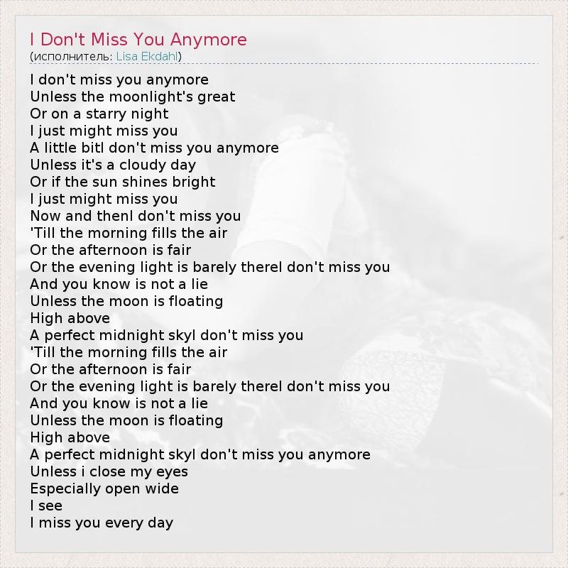 I don't miss you anymore Unless the moonlight's great Or on a starry night I just might miss you A little bitI don't miss you anymore Unless it's a cloudy day Or if the sun shines bright I just might miss you Now and thenI don't miss you 'Till the morning fills the air Or the afternoon is fair Or the evening light is barely thereI don't miss you And you know is not a lie Unless the moon is floating High above A perfect midnight skyI don't miss you 'Till the morning fills the air Or the afternoon is fair Or the evening light is barely thereI don't miss you And you know is not a lie Unless the moon is floating High above A perfect midnight skyI don't miss you anymore Unless i close my eyes Especially open wide I see I miss you every day