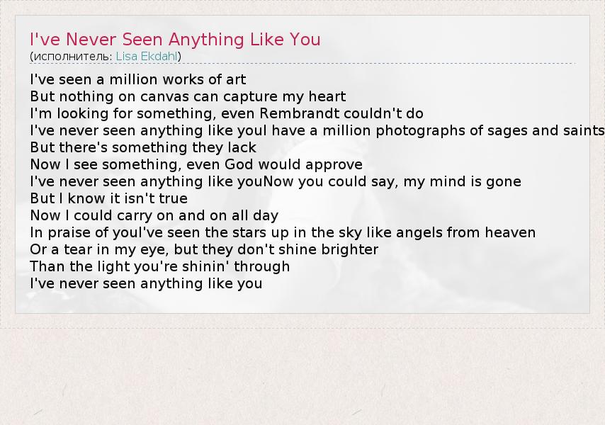 А как ты думаешь, о чем песня "I've Never Seen Anything Like You" ?